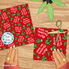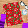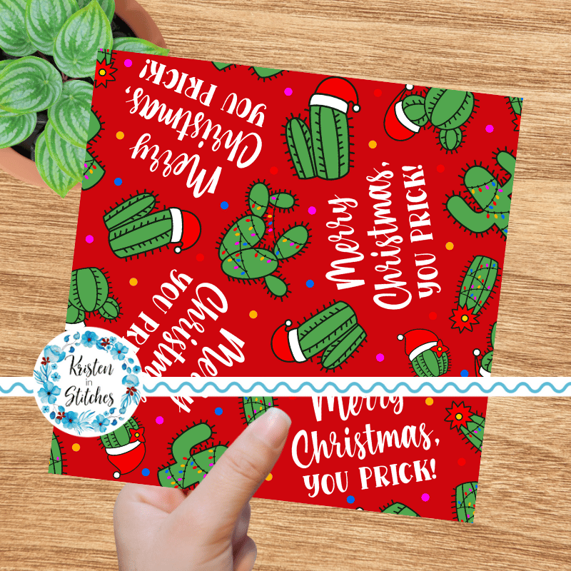 A sarcastic and sweary Christmas message! Don't be a prick, it's Christmas! Holiday cacti with Santa hats on red.
