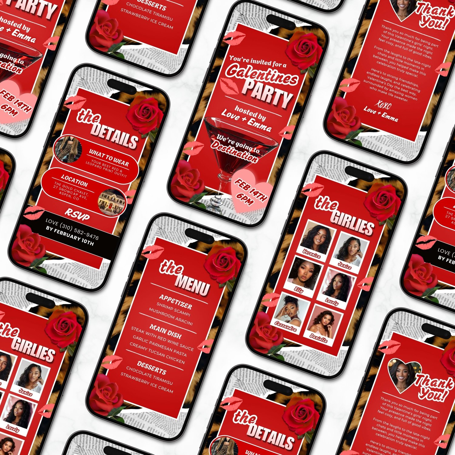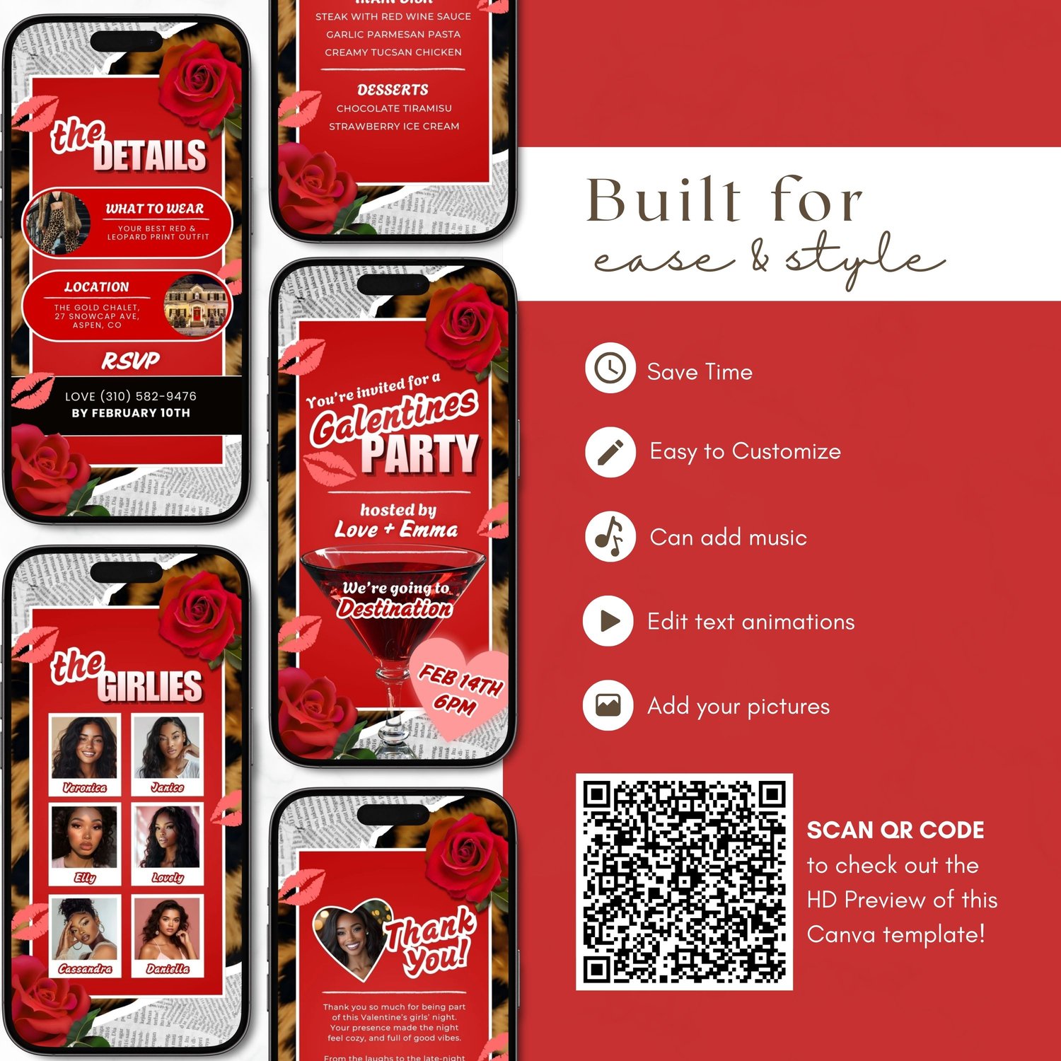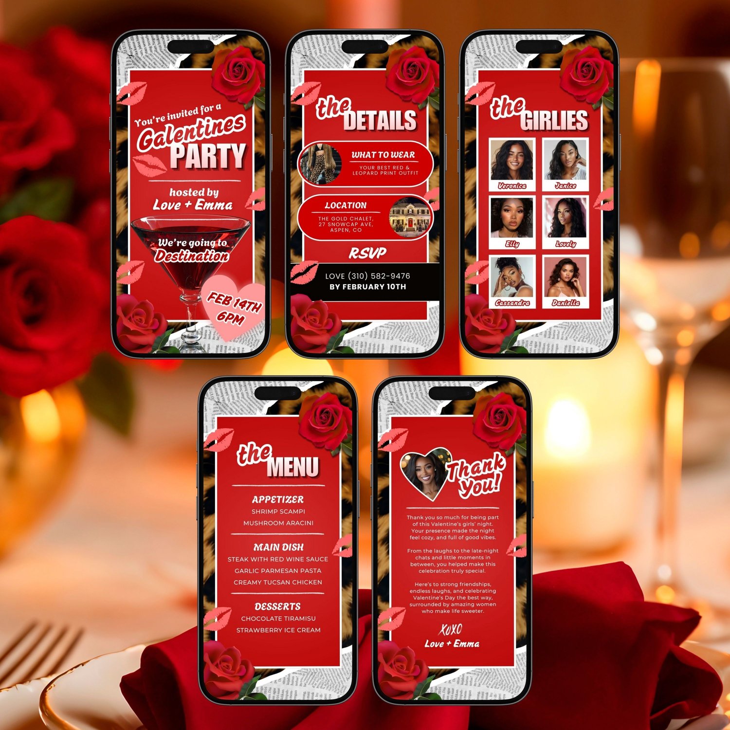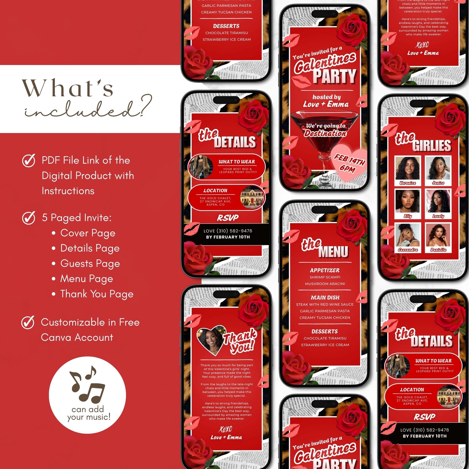 ❤️ Red Galentine’s Invitation Template for Cocktail Party | Valentine’s Leopard Theme Girls’ Night Invite | 5 Pages | Animated Canva Video Template ❤️