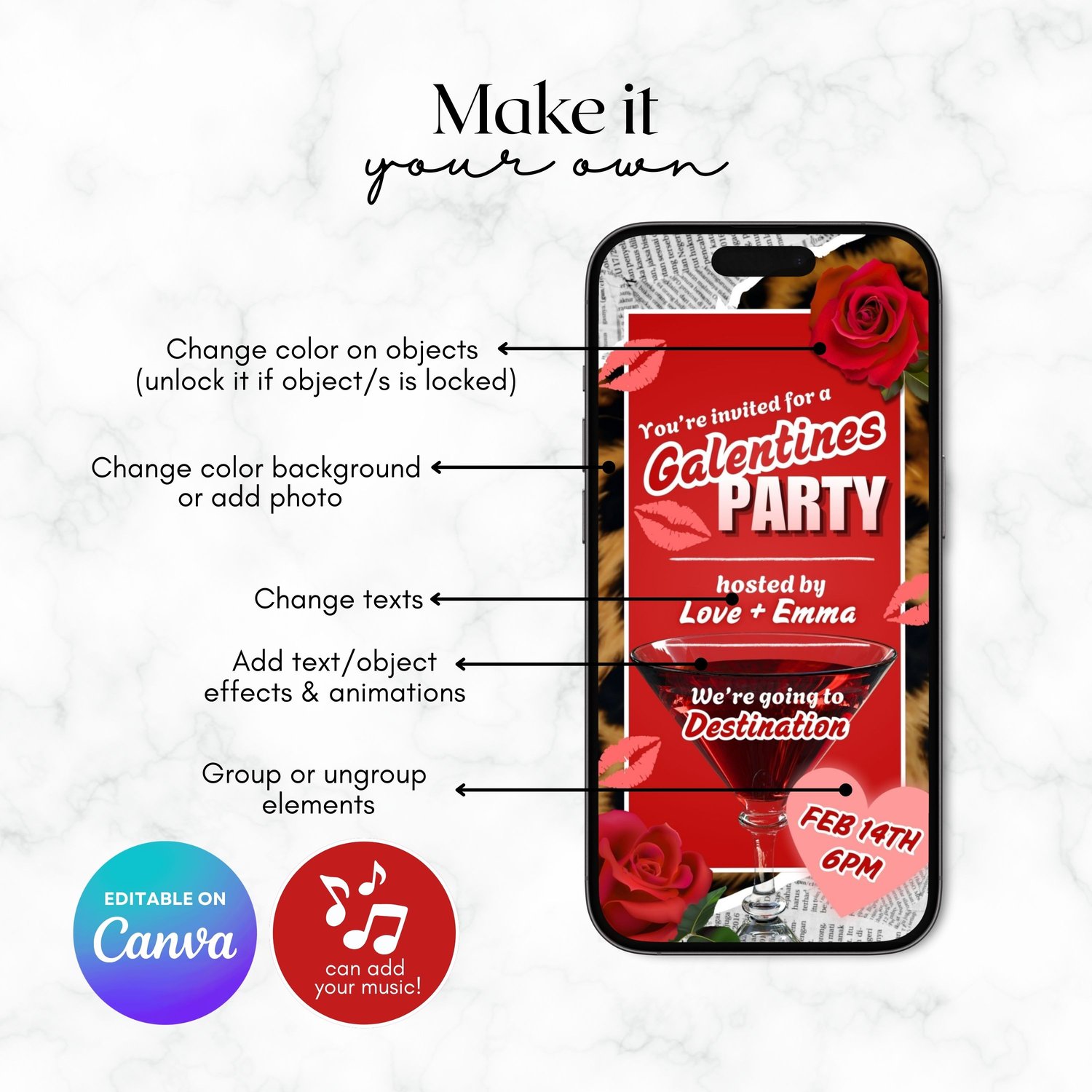 Turn up the heat this Valentine’s season with this Red Galentine’s Cocktail Party Invitation, designed for bold, confident girls’ nights and stylish Valentine’s celebrations. Featuring a leopard print accent, red roses & kisses vibes, and a glamorous party feel, this animated digital invite sets the mood for an unforgettable night of cocktails, laughter, and friendship.