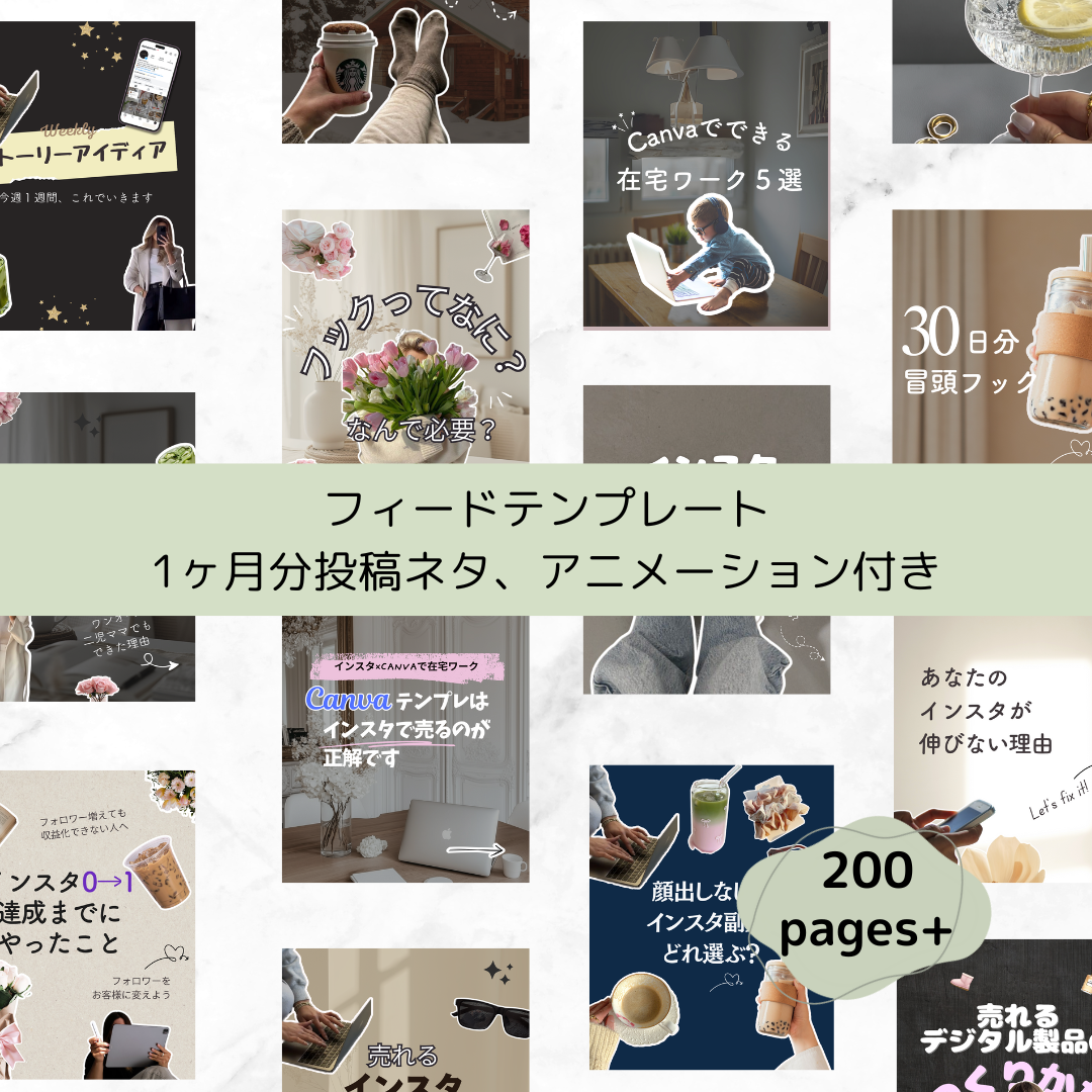 こちらは個人利用限定なので再販売は不可ですが、デザインだけでなく投稿内容も1か月分付いているので、販売開始からインスタ投稿に困らず、即スタートできます。