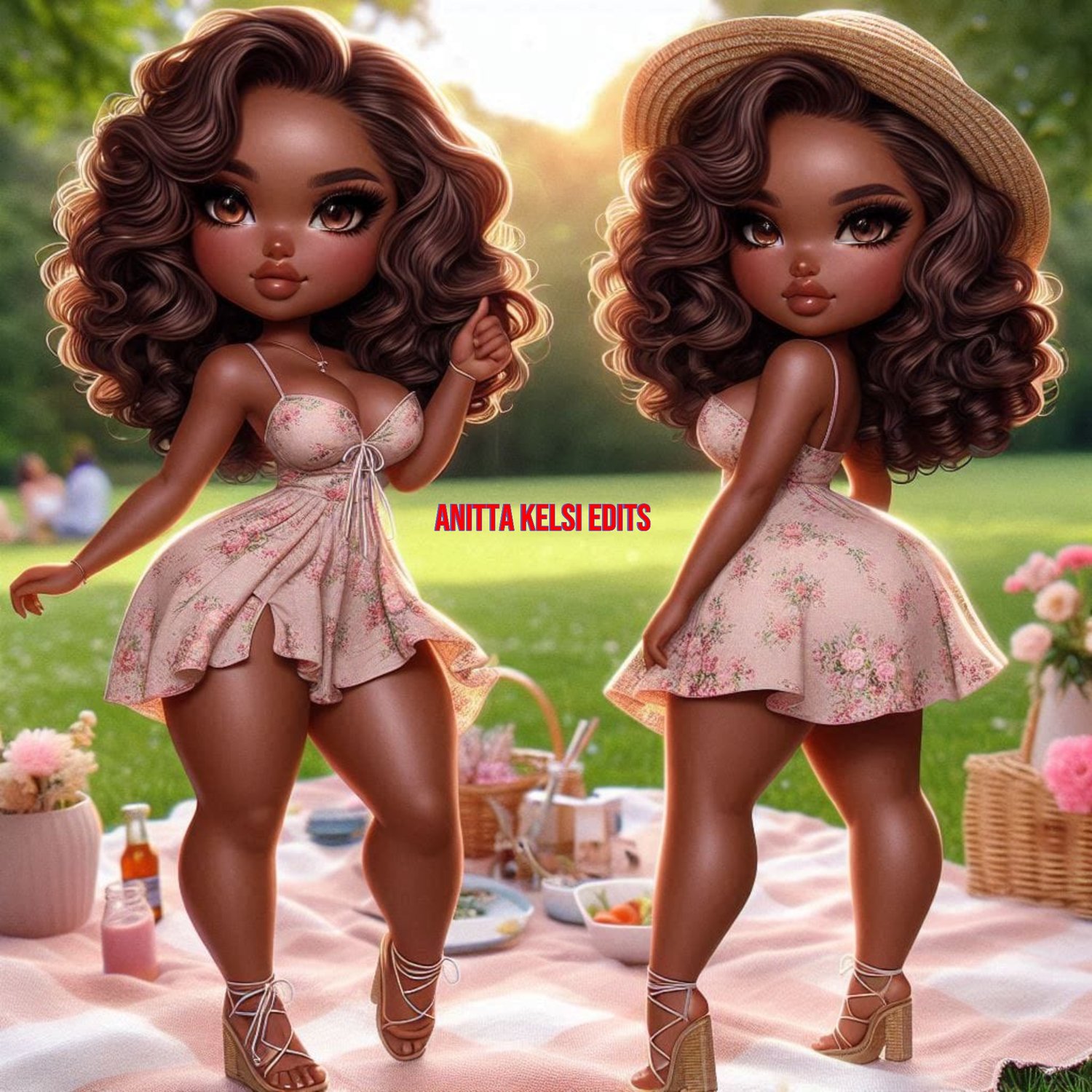 Bring sunshine and style to your collection with this ultra-realistic curvy melanin chibi duo! These gorgeous chibis are glowing with cocoa-rich skin, voluminous curls, and confident charm. Styled in soft floral picnic dresses and strappy heels, they strike playful poses on a cozy picnic setup full of fresh vibes, fruits, and flowers. Perfect for planners, stickers, digital journaling, or print decor!