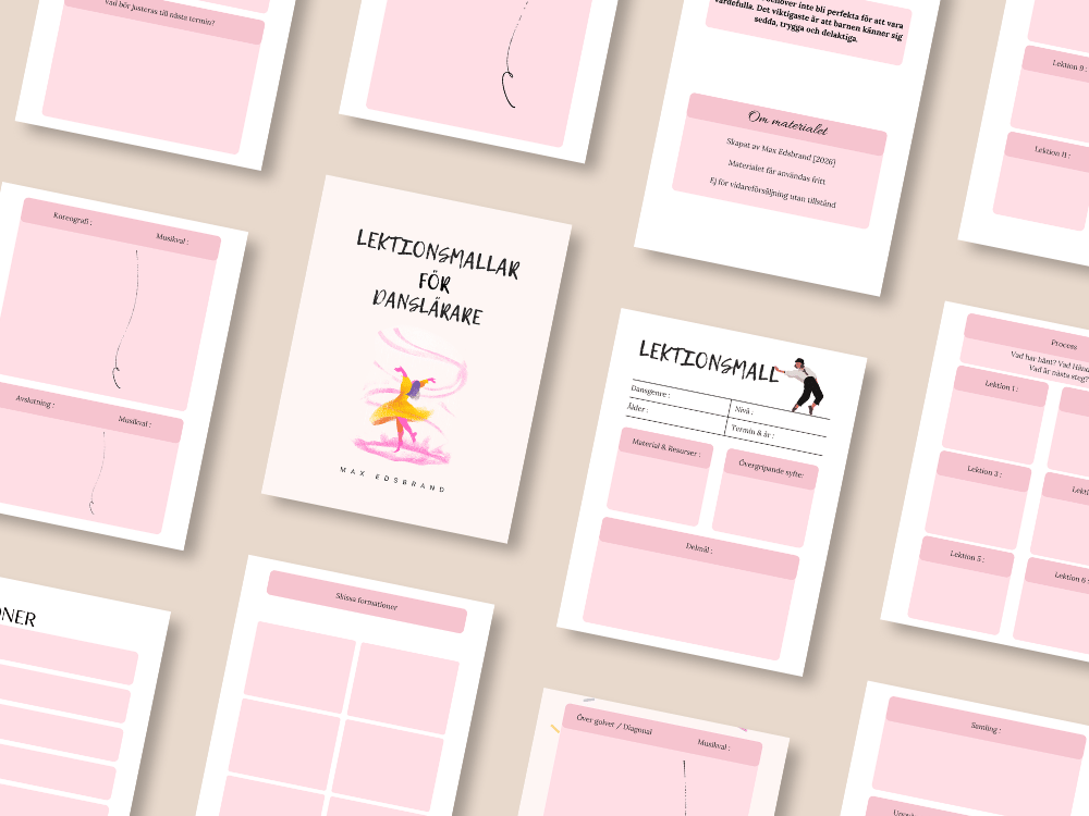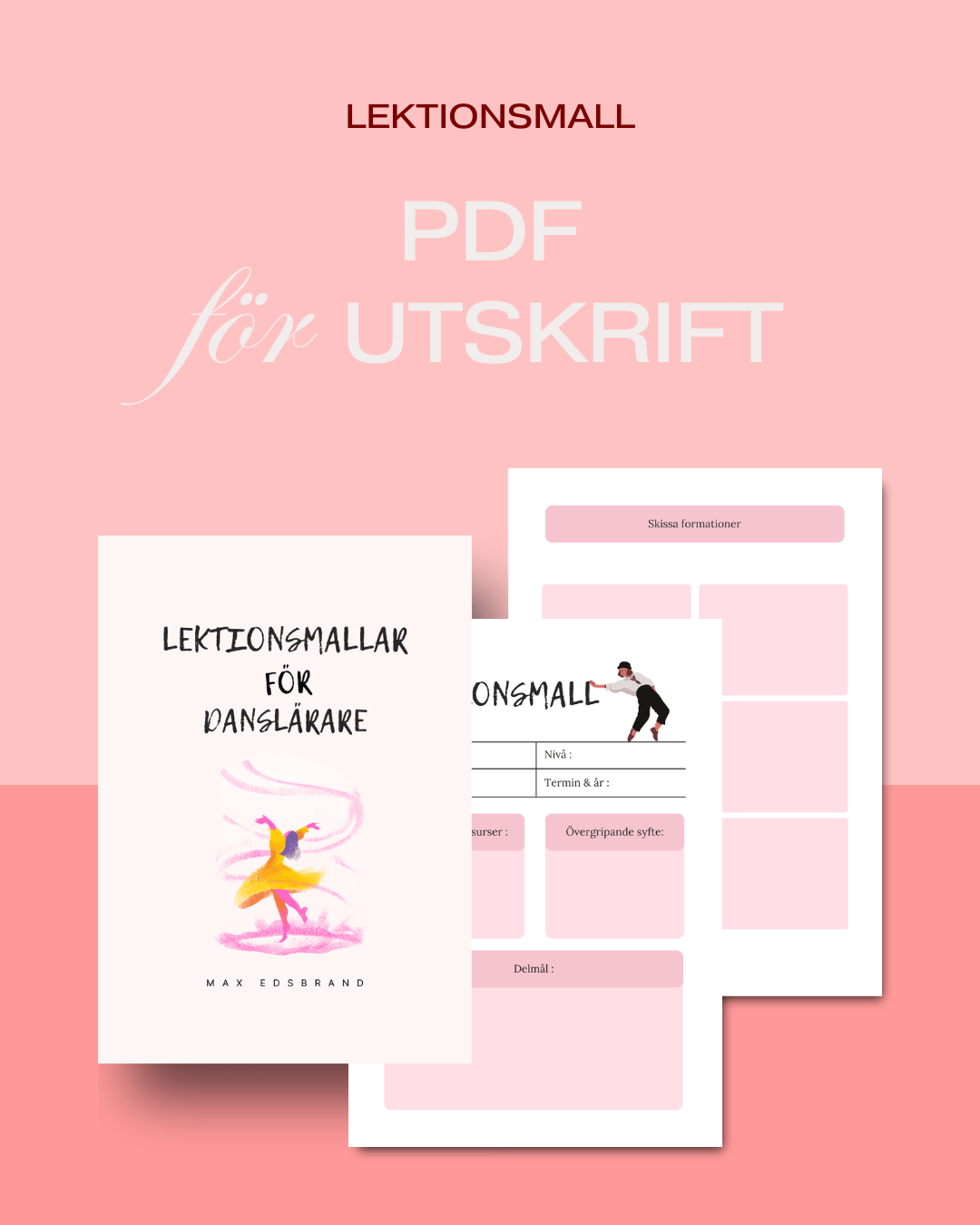 Förenkla och strukturera planeringen av dina danslektioner med denna praktiska lektionsmall för danslärare. Boken innehåller en lektionsmall som ger en tydlig struktur för danslektioner: samling, uppvärmning, över golvet/diagonal, koreografi och avslutning. Mallen är avsedd att skrivas ut och fyllas i utifrån dina egna idéer och behov.