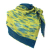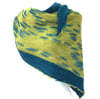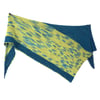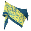 This asymmetrical triangular shawl transitions between broken rib, wide bands of garter stitch, and a stockinette section with optional elongated stitches. A picot bind-off adds a fun pop of color along the final edge. The pattern sections are easily adaptable to use up all of one’s yarn.