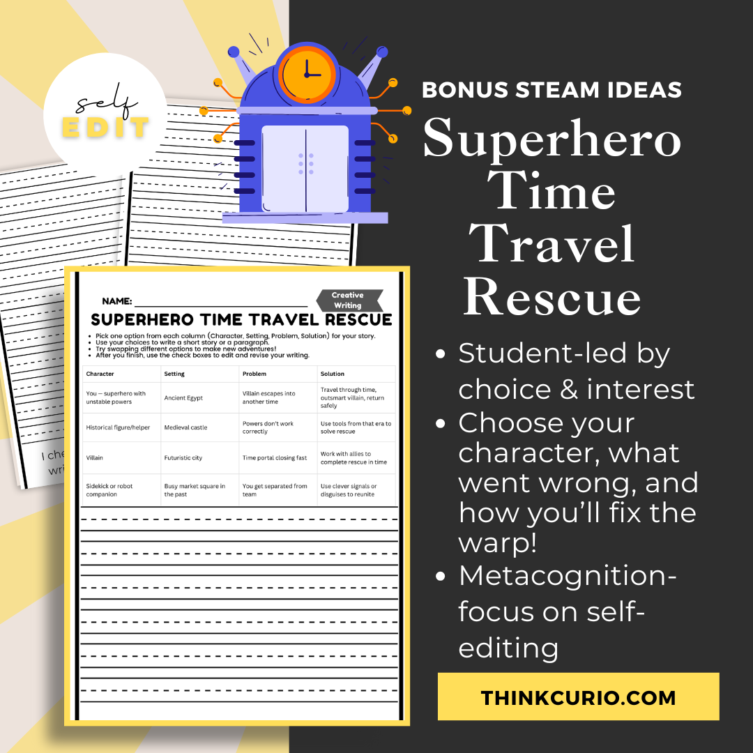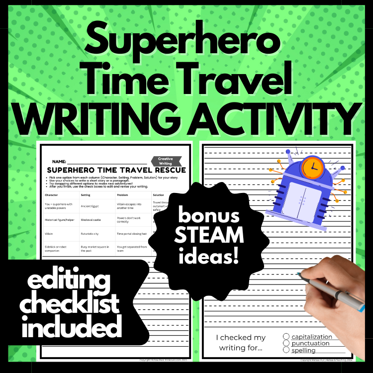 Take your students on an epic journey throughĀ Ancient Egypt, medieval castles, and futuristic citiesĀ withĀ Superhero Time Travel Rescue! In this creative writing activity, 2ndā5th graders mix and match characters, settings, problems, and solutions to create thrilling time-traveling superhero adventures.