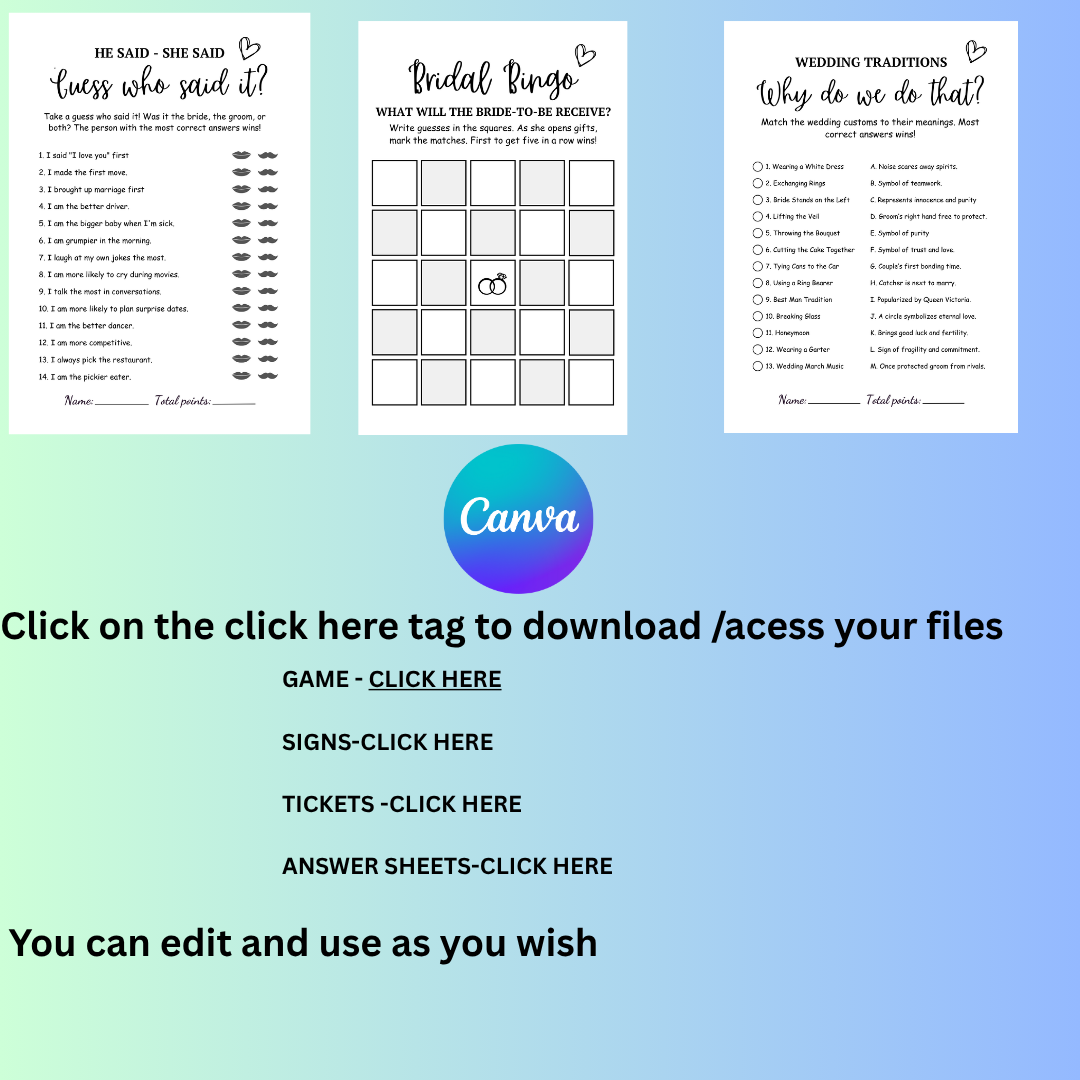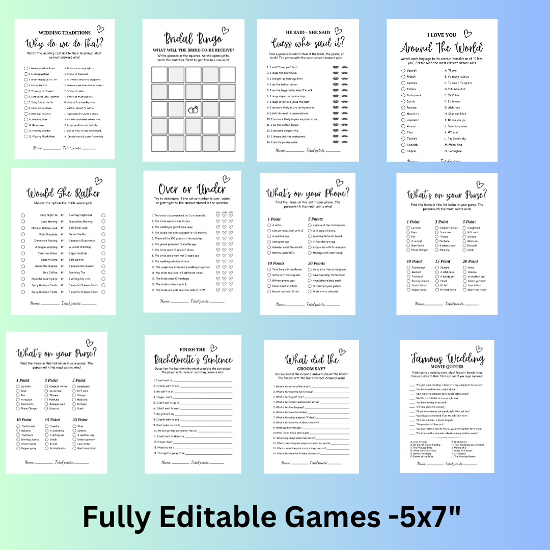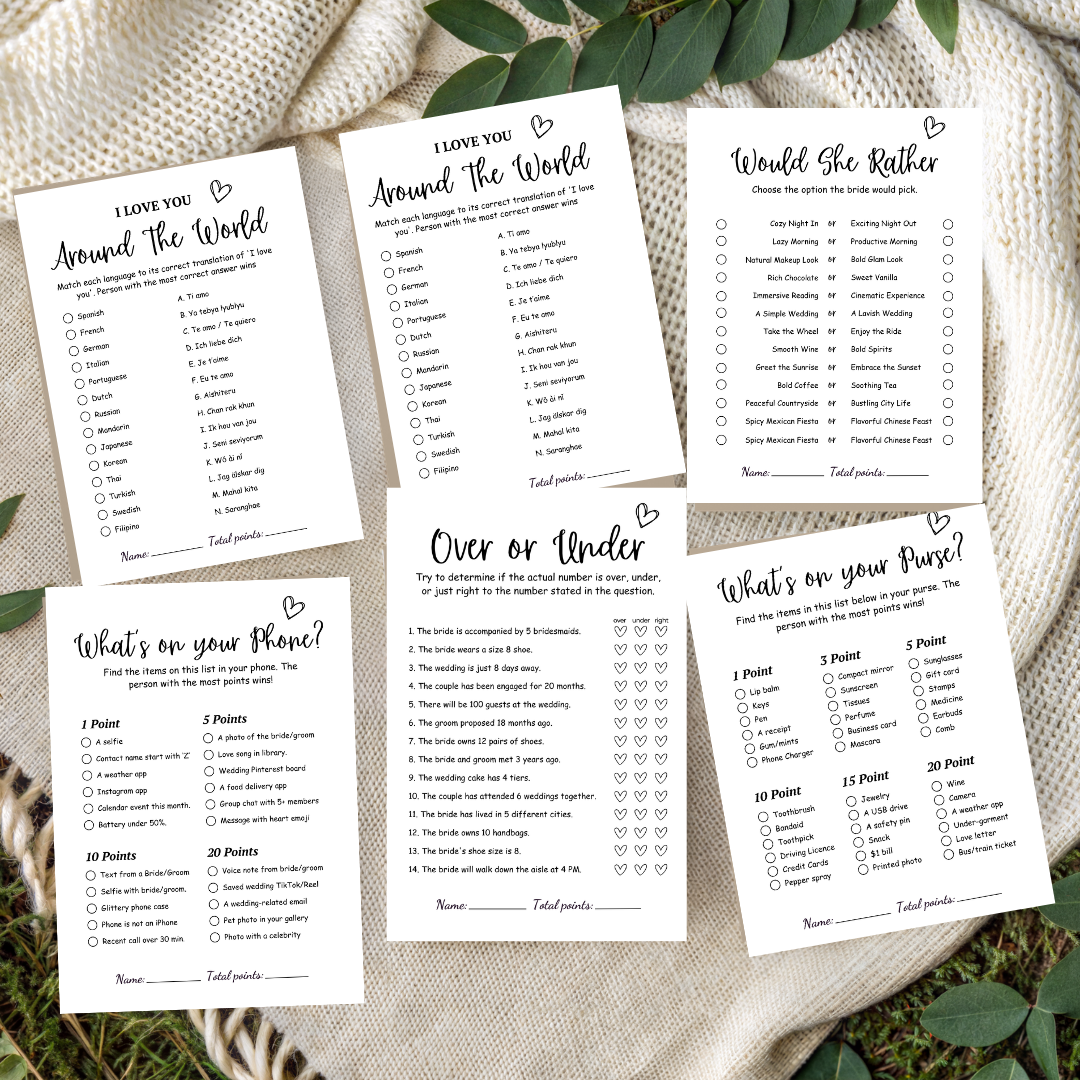 This bundle includes 20+ fun and engaging bridal shower games, professionally designed and ready to print instantly. Add effortless style and unforgettable moments to your event!