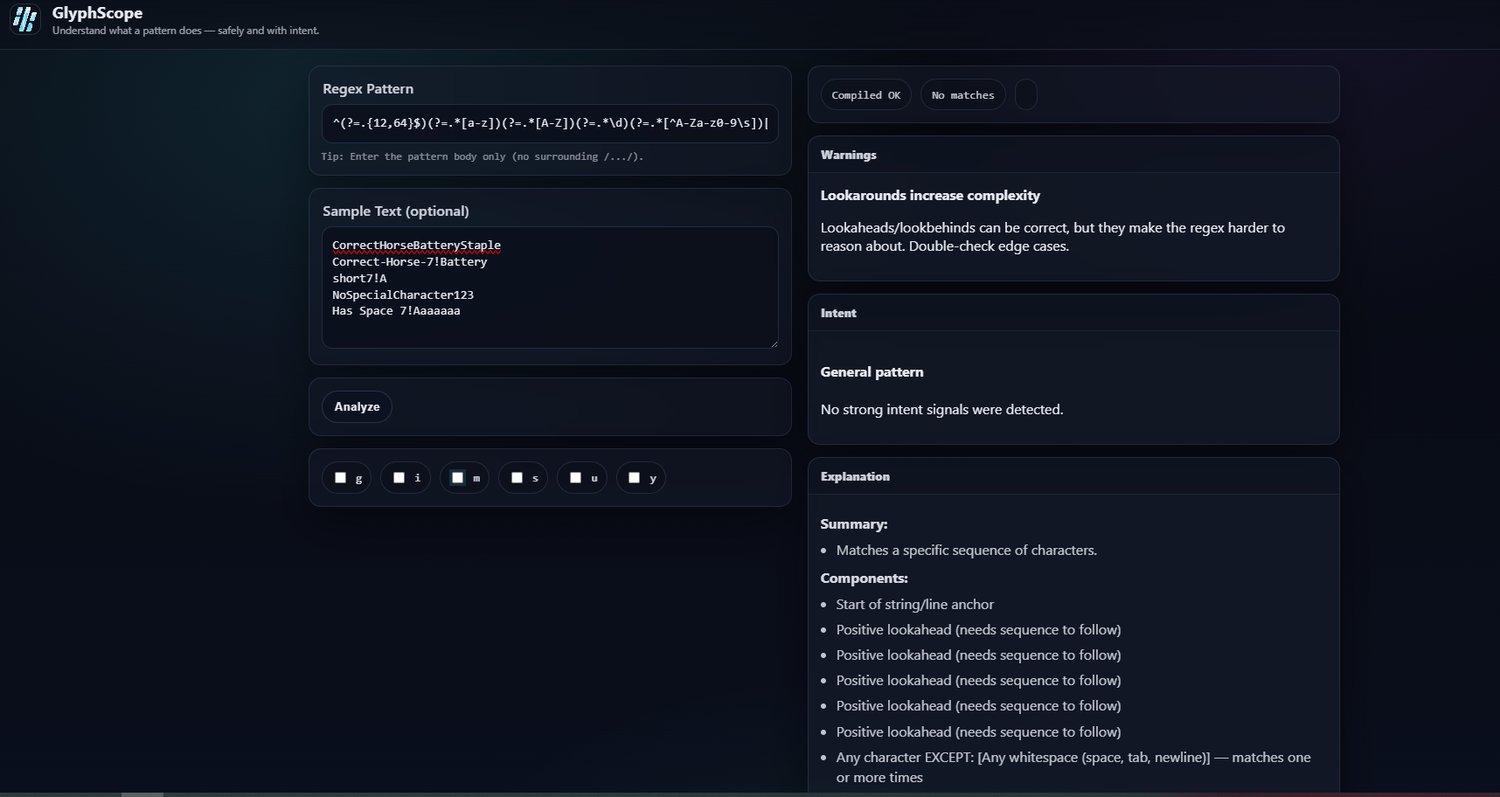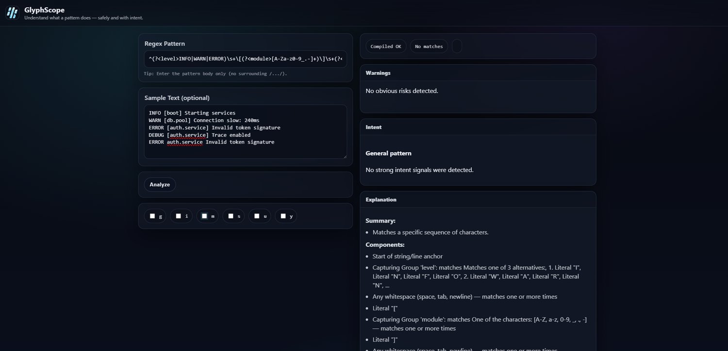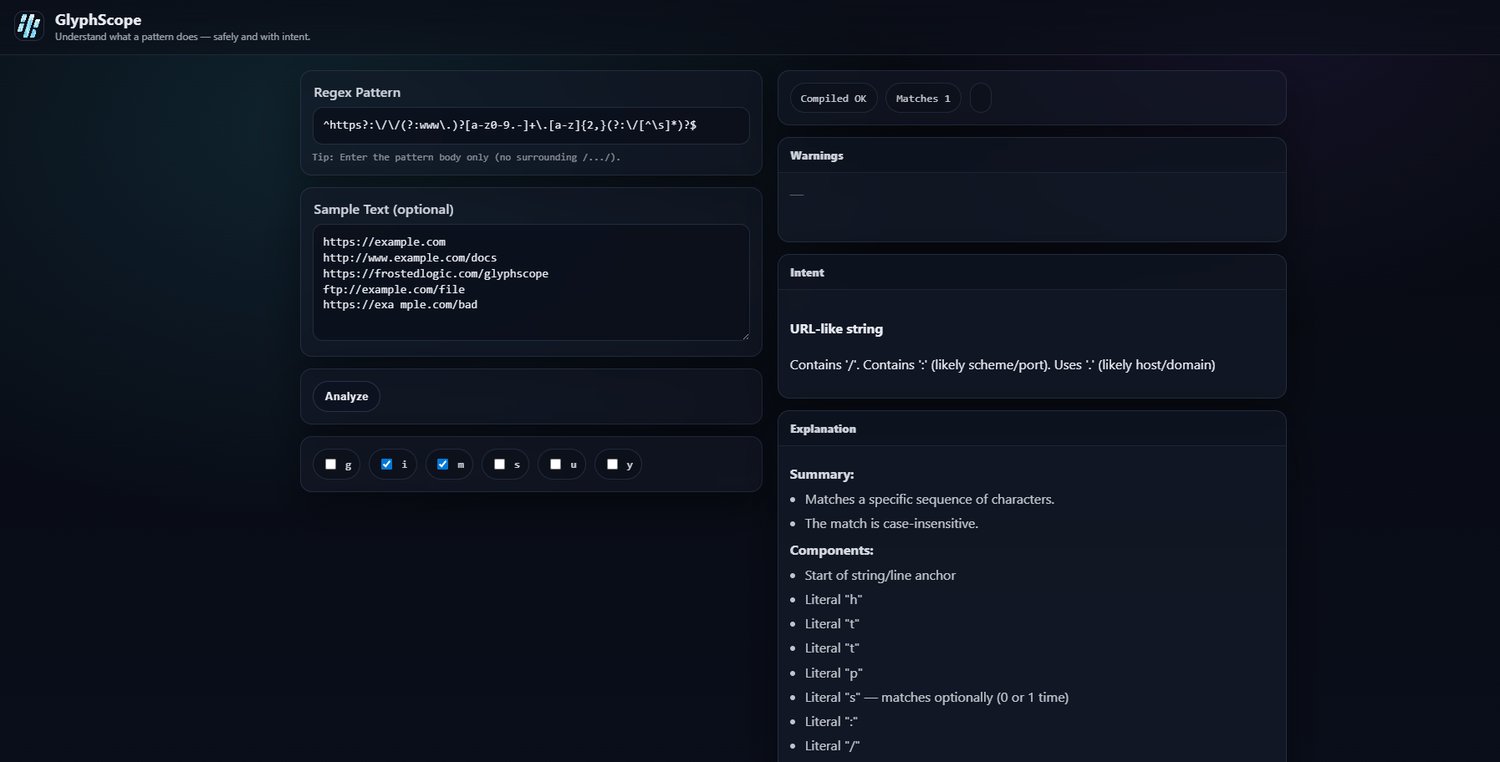 GlyphScope is a regex inspection and explanation tool built for developers who regularly inherit patterns from codebases, StackOverflow, or AI chat outputs — and want to verify what a pattern actually does before shipping it into validation logic.