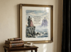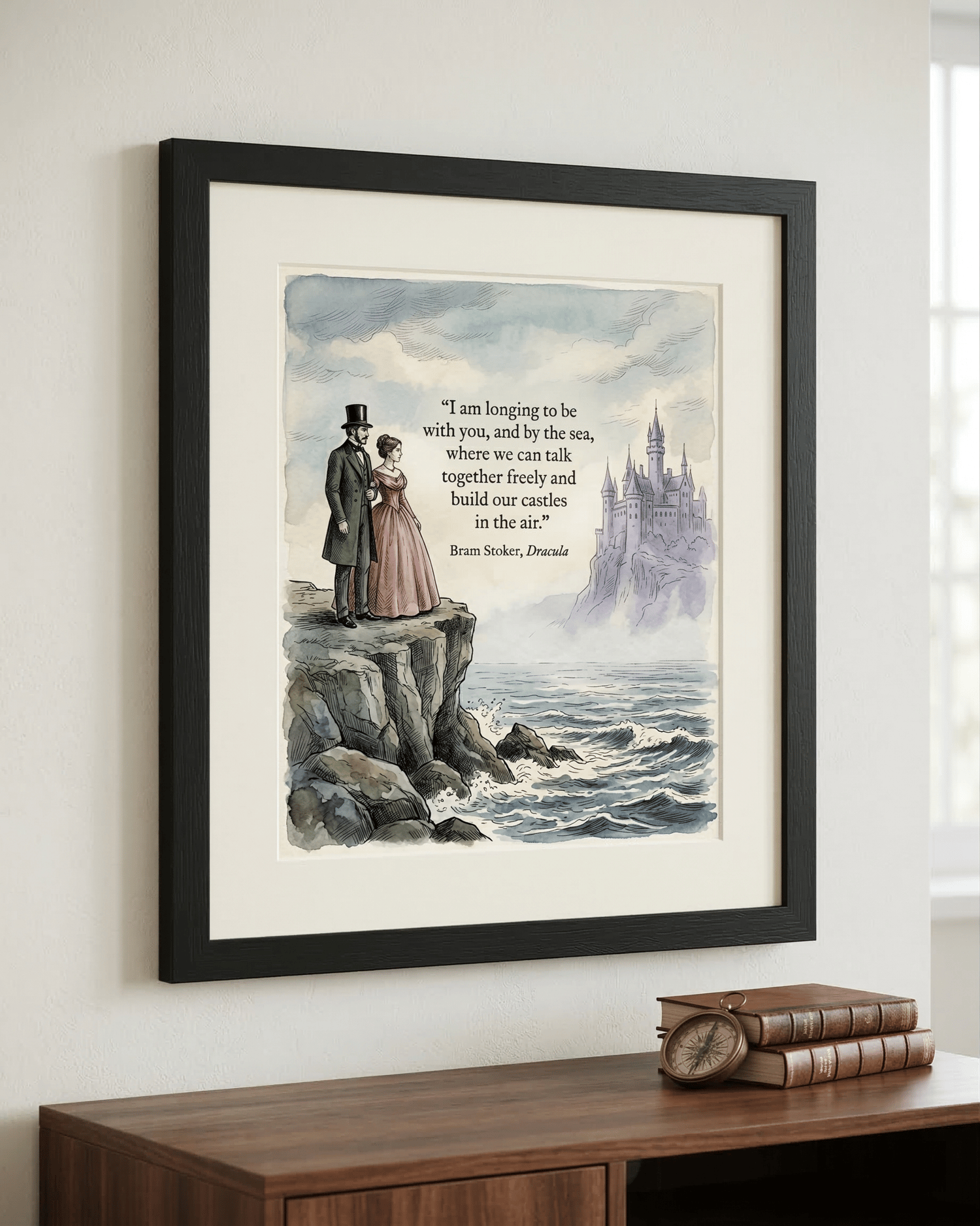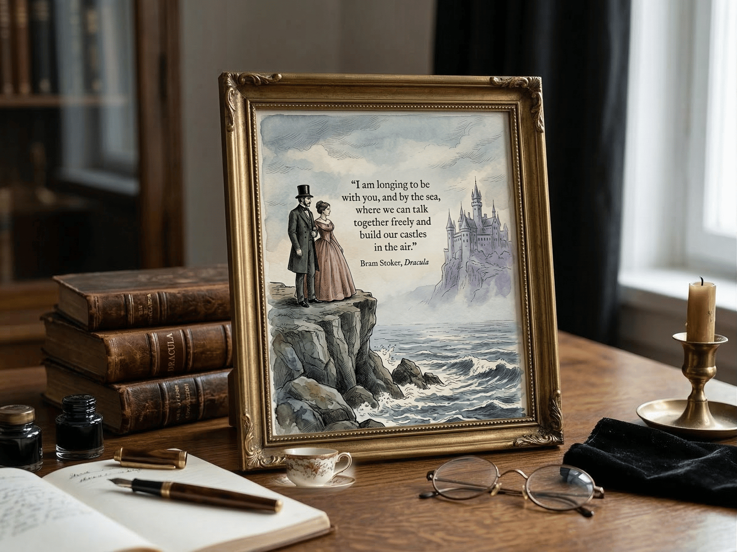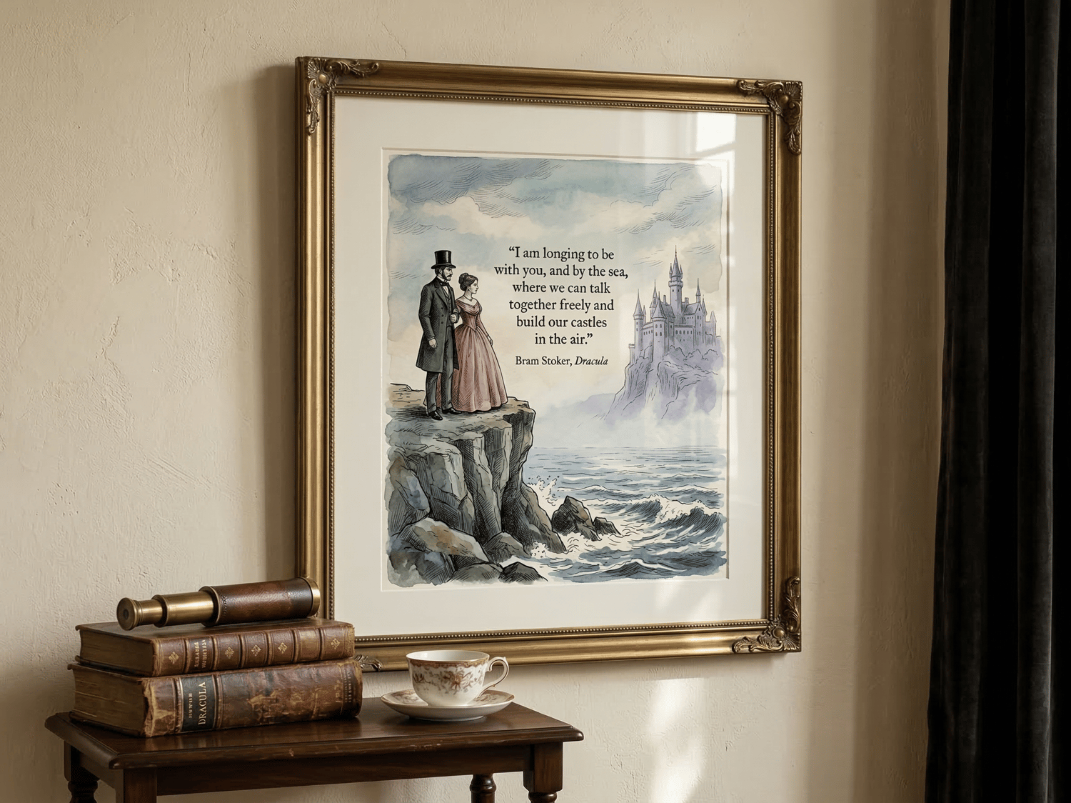 A moody, atmospheric tribute to the master of gothic horror. This digital art print combines sharp Victorian line work with soft, muted watercolor washes in Prussian blue, forest green, and dusty rose. Featuring the iconic "Castles in the Air" quote from Dracula, this piece evokes the mist-heavy atmosphere of the English coast.
