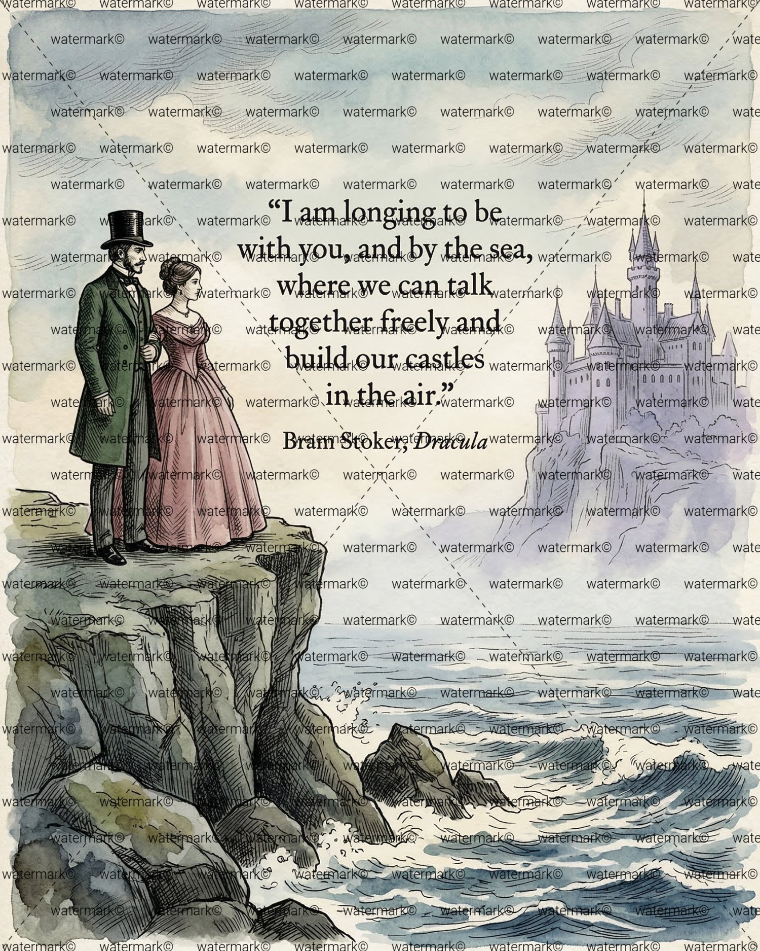 8x10 Watercolor, Gothic Watercolor, Dark Academia Art, Romantic Goth Decor, Bram Stoker Dracula, 300 DPI Art, Literary Quote Decor, Moody Wall Art, Victorian Couple Art, Watercolor Illustration