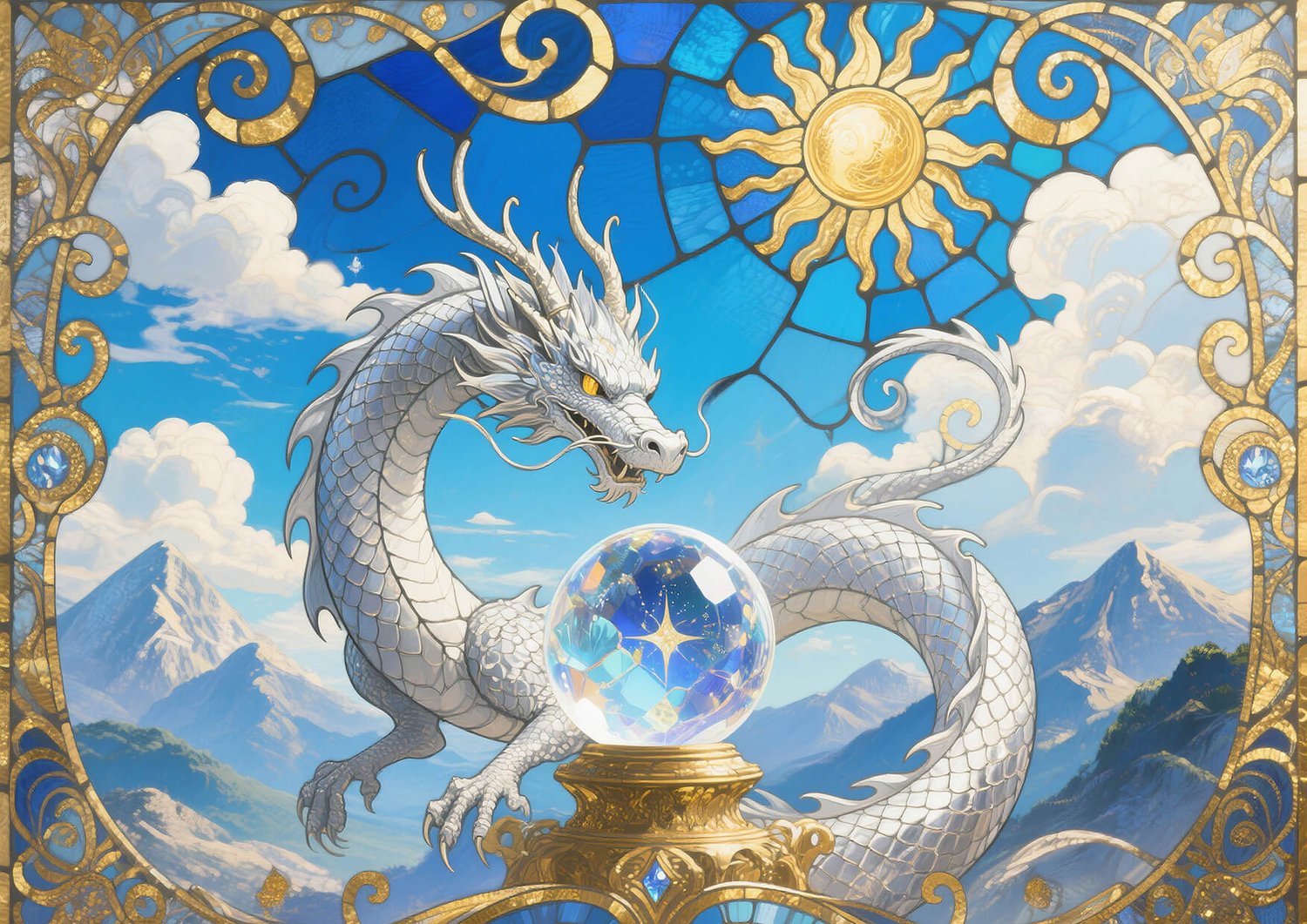 A stunning silver dragon soars through a magnificent blue sky filled with clouds, mountains, swirling patterns, and the sun â accompanied by a mystical crystal ball in this enchanting fantasy illustration.
