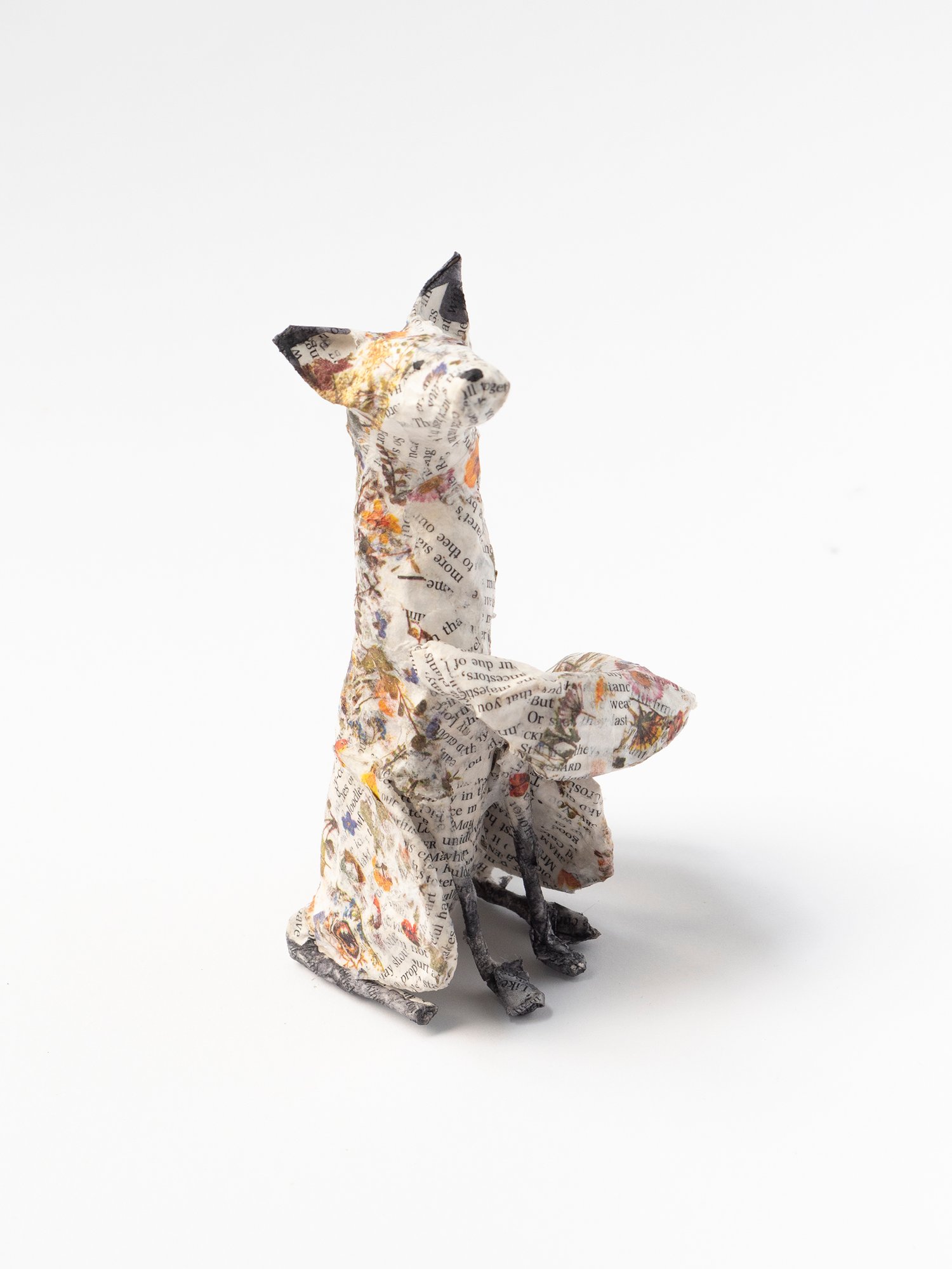 A handmade paper mache folk art sculpture of a sitting fox. It is created from paper mache using book paper, wire, printed tissue paper and watercolour and is approx 12cm high. Made with newspaper, wire, glue, pages from Shakespeare, tissue paper, and watercolour paint.