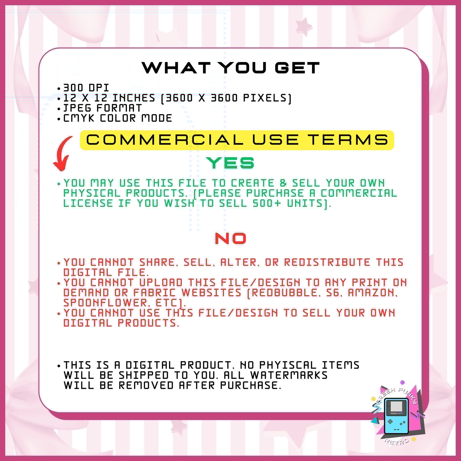 - You cannot upload this file/design to any print on demand or fabric websites (Redbubble, S6, Amazon, Spoonflower, etc).