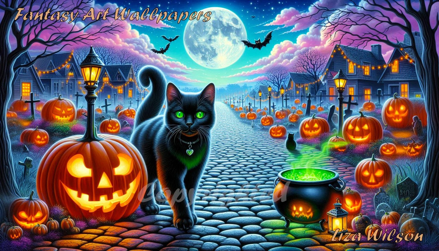 Halloween black cat on a cobbled path with spooky haunted houses, twisty dark trees, tombstones, lakes, glowing pumpkins, witches cauldrons & bats silhouetted in a starry purple moonlit sky.