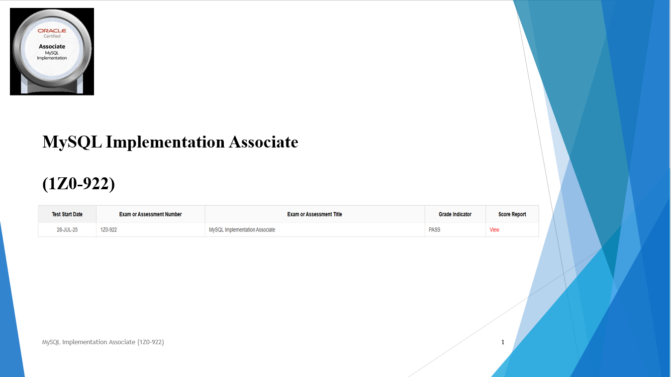 Exam Dump - MySQL Implementation Associate (1Z0-922) Updated October 23, 2025 includes 50 questions and answers.