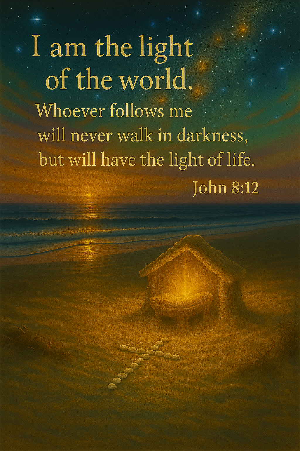 Radiate hope and spiritual clarity with this Sunset Manger Scripture Poster, featuring a glowing manger at the shoreline, a cross formed from stones in the sand, and a sky filled with stars fading into sunset hues. Paired with John 8:12, this printable offers comfort, guidance, and divine presence β perfect for devotional kits, seasonal bundles, or ministry gifts.