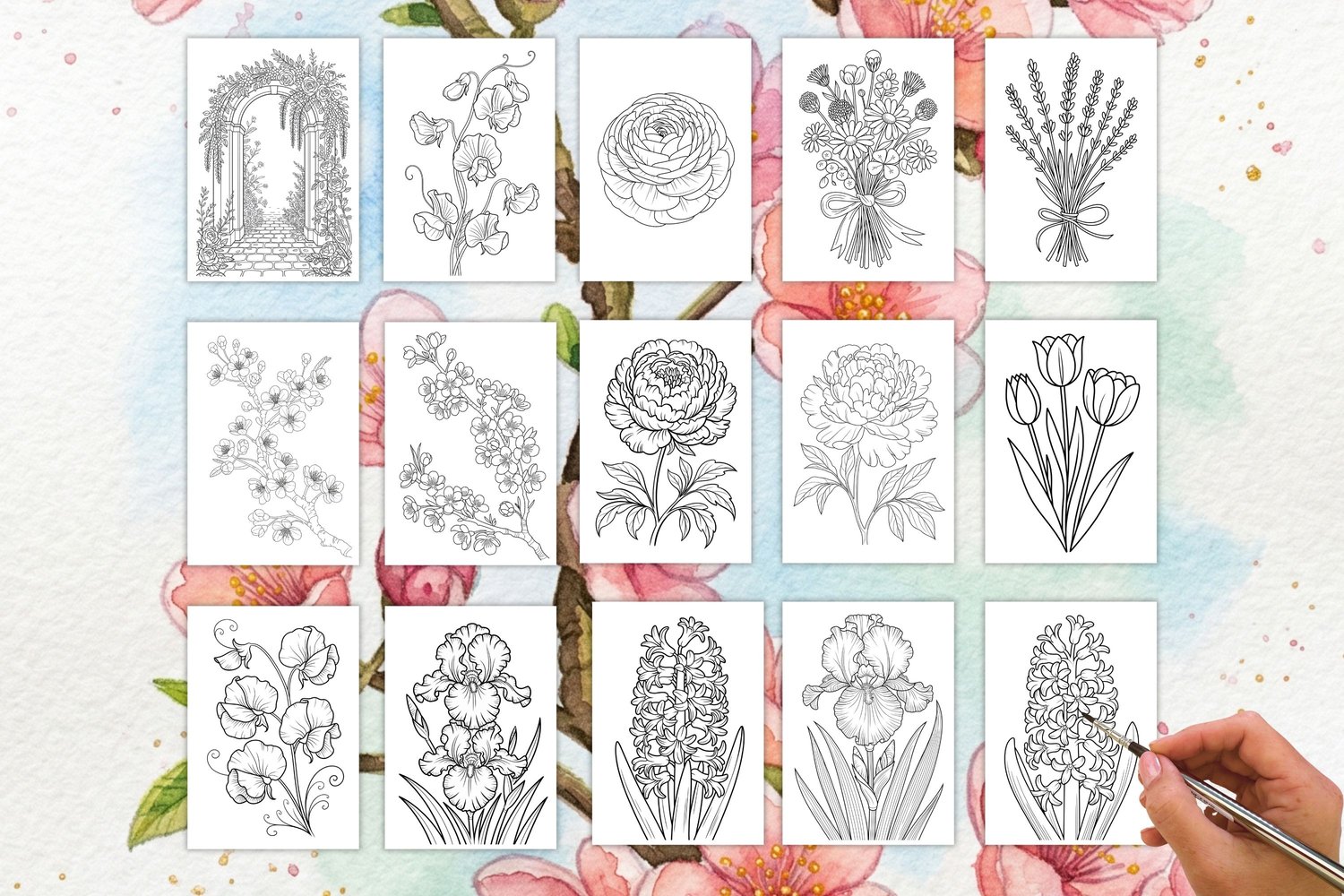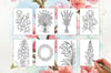 Printable spring botanical watercolor templates and matching digi stamps — 38 hand-drawn floral designs ready to print, paint, and create with.
