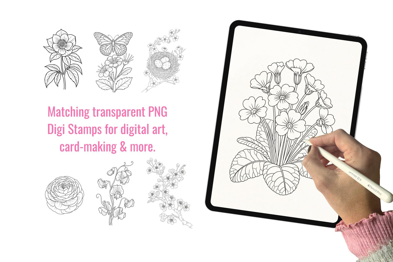 Print on watercolor paper (190gsm+) and trace or paint directly onto the outlines. Or print on regular paper for coloring with pencils, markers, or pens. The transparent PNG digi stamps can be imported into Procreate, Canva, or any design app for digital art projects, card-making, scrapbooking, and junk journal pages.