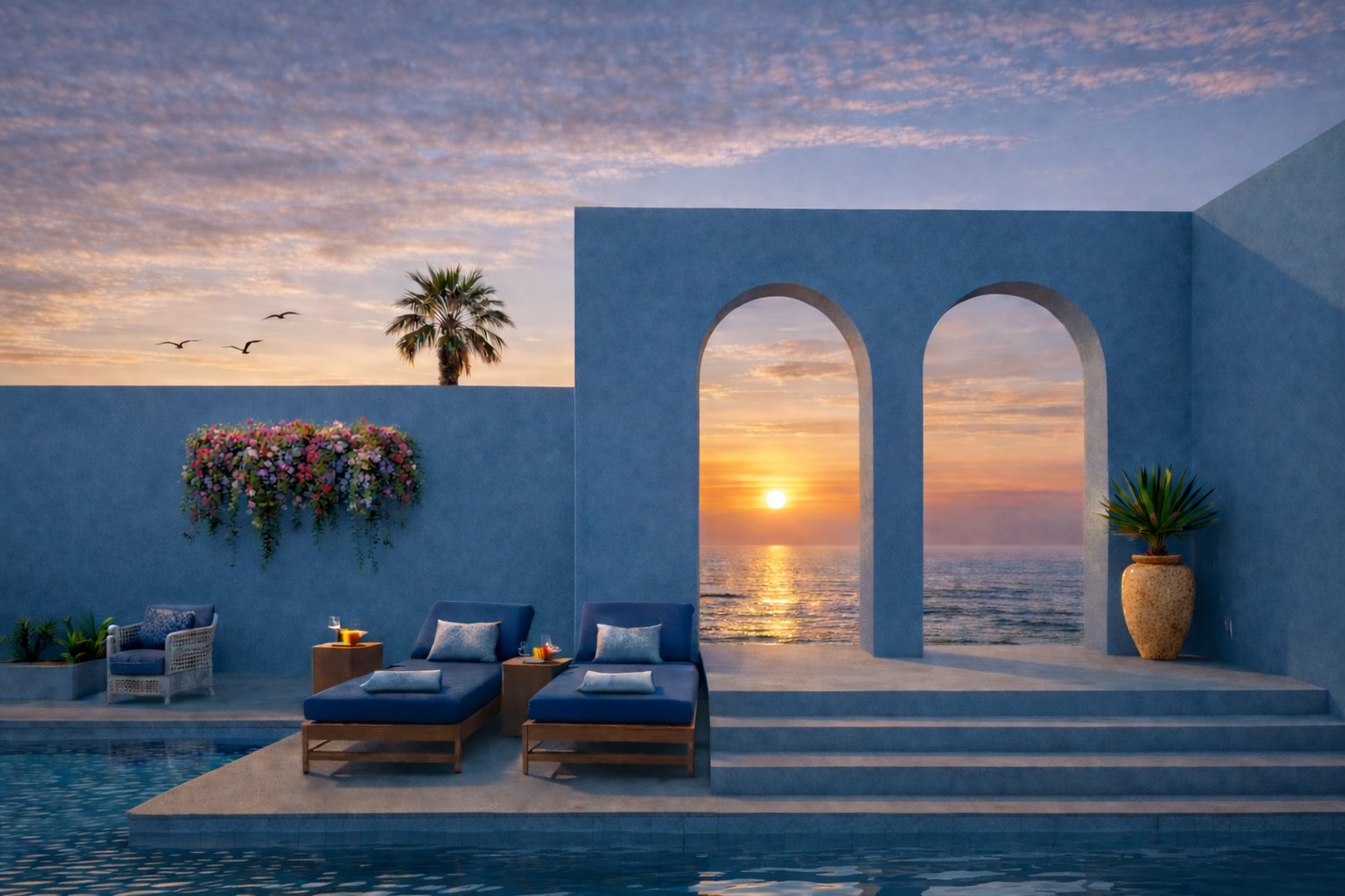 Architectural design illustration showing the sunset view from within a residence in a Mediterranean setting.