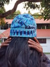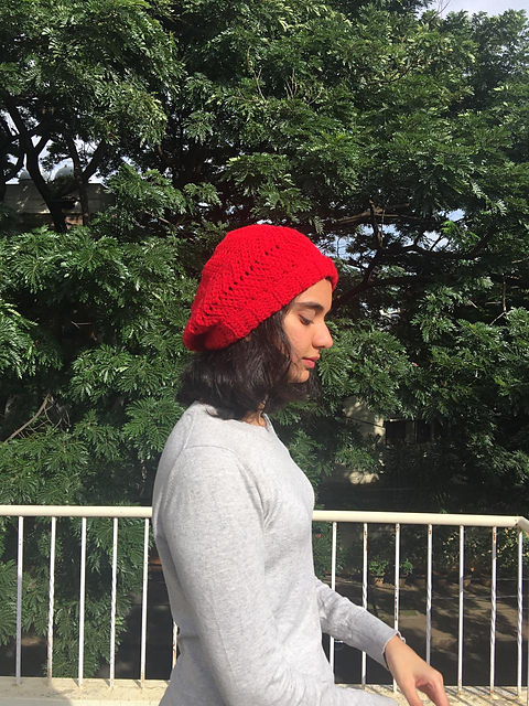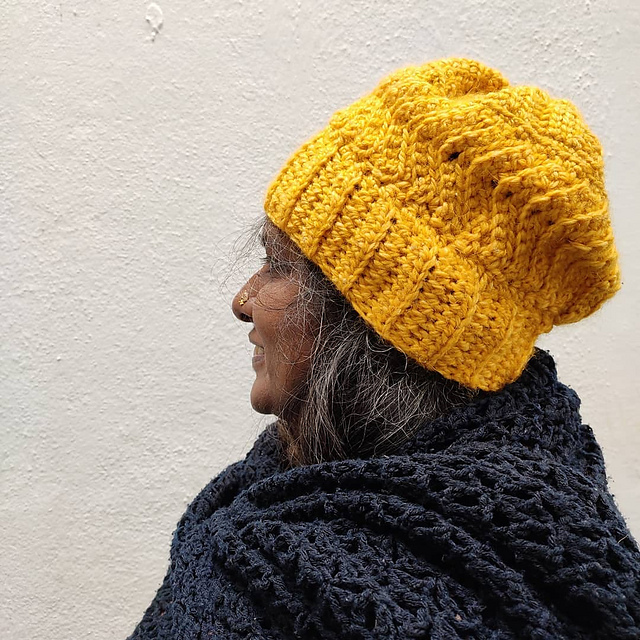 The half double crochet worked in the back loop provides the ribbing for the brim , worked sideways. The ripple band is also worked sideways and joined to the brim as you make it. The subsequent section is worked in the round and the hat is cinched at the top to make up the crown. Adding a pompom adds a perfect touch to the beanie:)