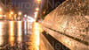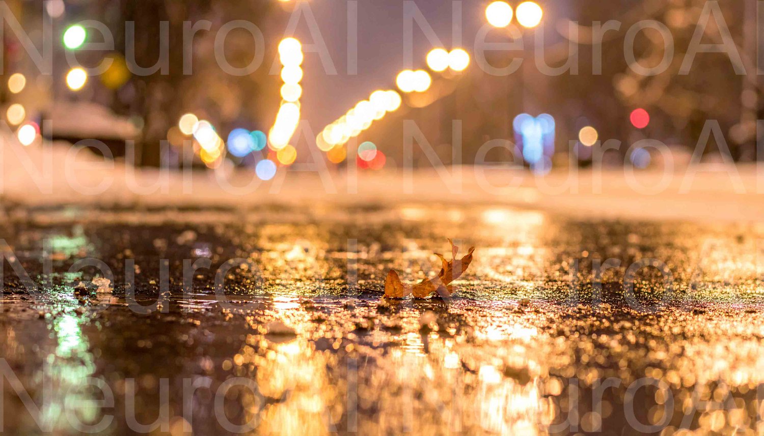 Golden leaf reflects city lights on wet pavement