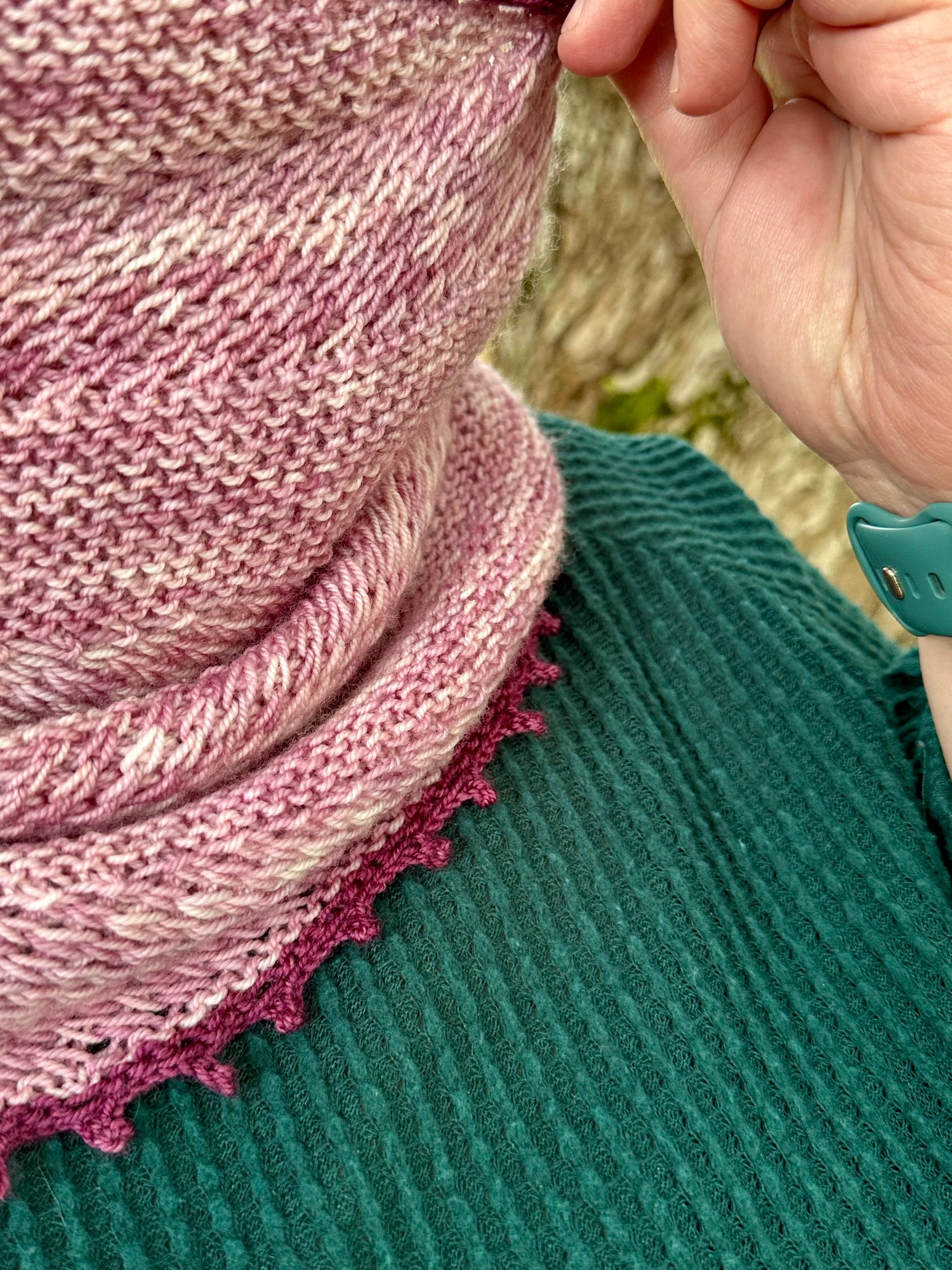 The shawl features rows of garter stitch alternating with sections of a lace motif, which creates interest in both the making and wearing of this accessory. The lace sections allow the wingspan and the depth of the shawl to grow while also providing loftiness to the shawl, making for a cozy feel around the neck.