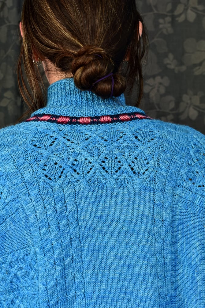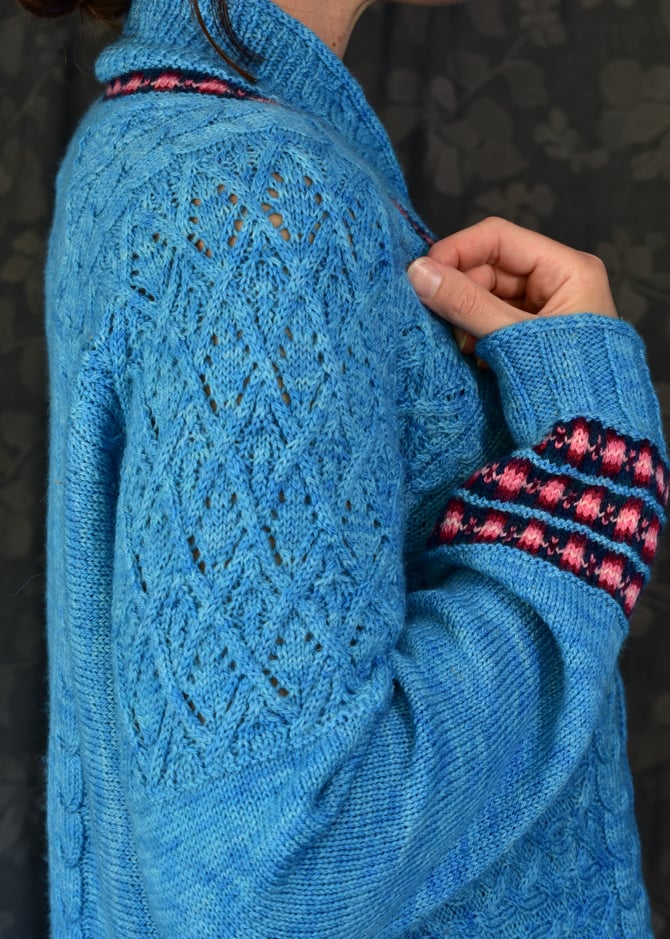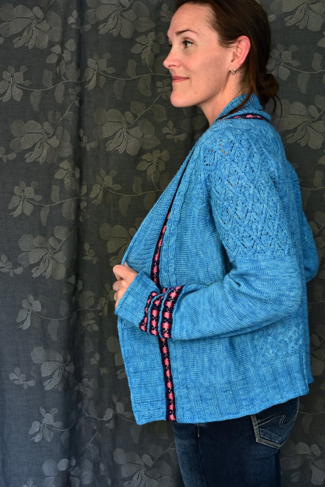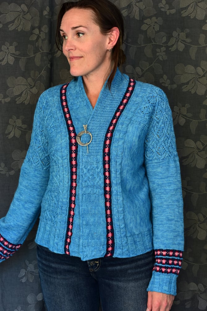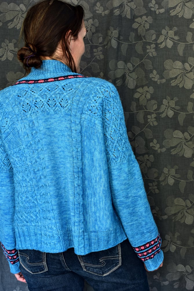 This drop shoulder, modular cardigan is started at the upper back neckline, then the back centre panel is worked down the lower back. Two cable bands are picked up at the shoulders and worked down the lower fronts. Stitches are picked up, and the left side is worked sideways with decreases for the shoulder shaping. Once the width is achieved, the sides are joined with a 3-needle BO and the sleeve stitches are placed on hold. Stitches are picked up for the right side and the right side is worked in a similar manner. Sleeves are worked in the round down to the cuff. Hem cables and ribbing is worked, then the neckband stitches are picked up, the stranded neckband stranded colorwork is knit, then the neckband cables and ribbing is worked. The hem, cuffs, and neckband are all finished with an I-cord for a polished edge.