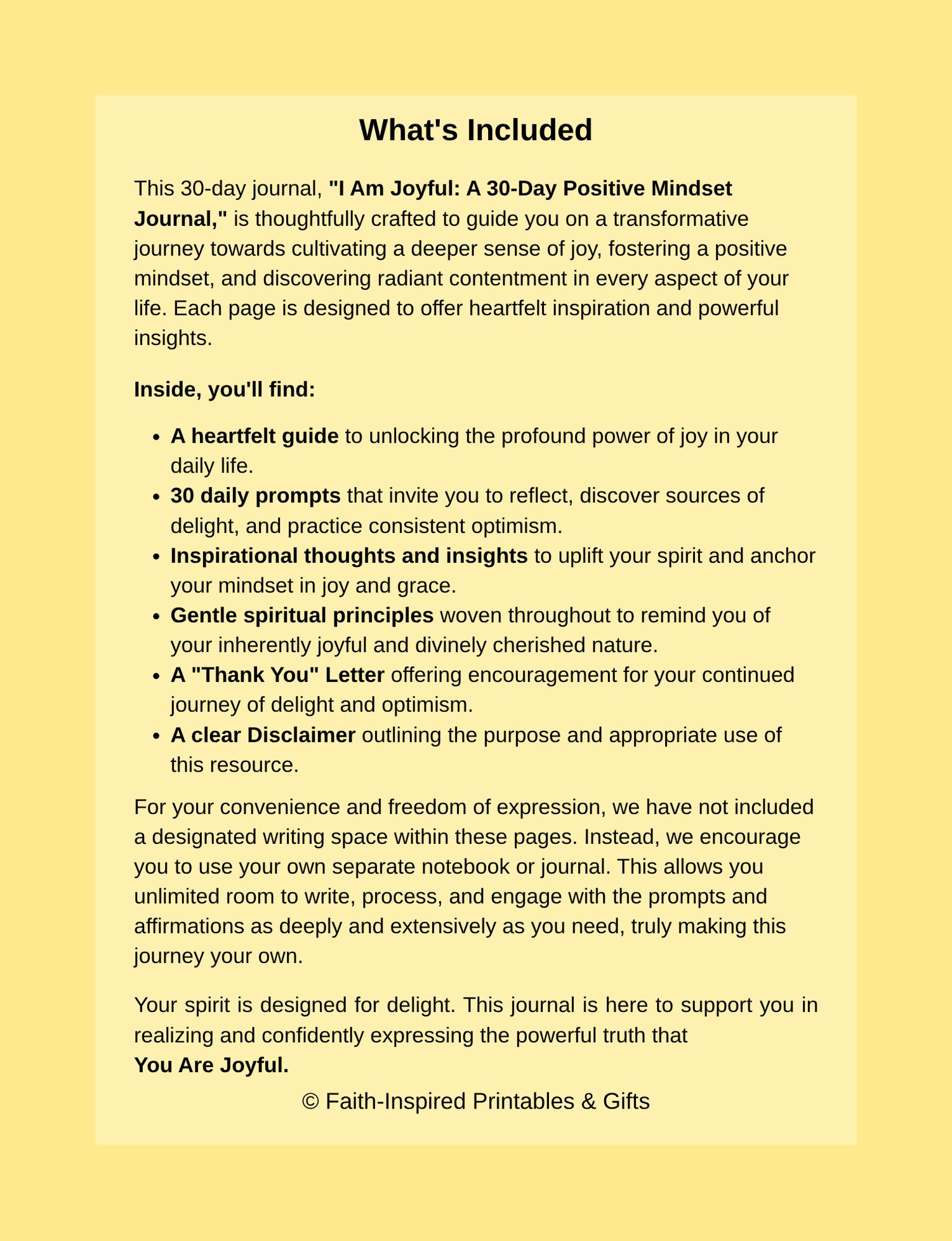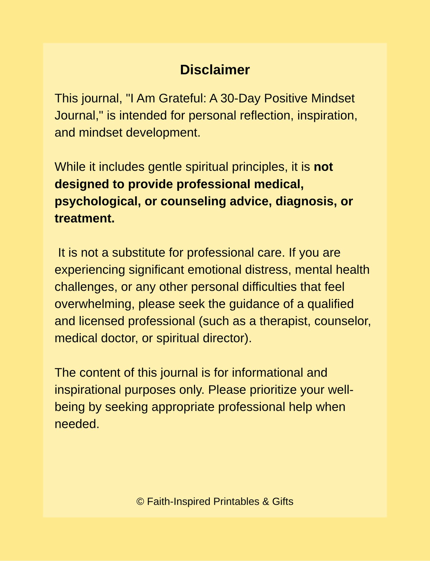 I am not a therapist, counselor, or mental health professional. This journal is not intended as a substitute for professional advice, diagnosis, or treatment. If you are experiencing emotional distress, anxiety, or depression, please seek help from a qualified professional. This resource is for personal reflection, faith-based encouragement, and mindset growth only.