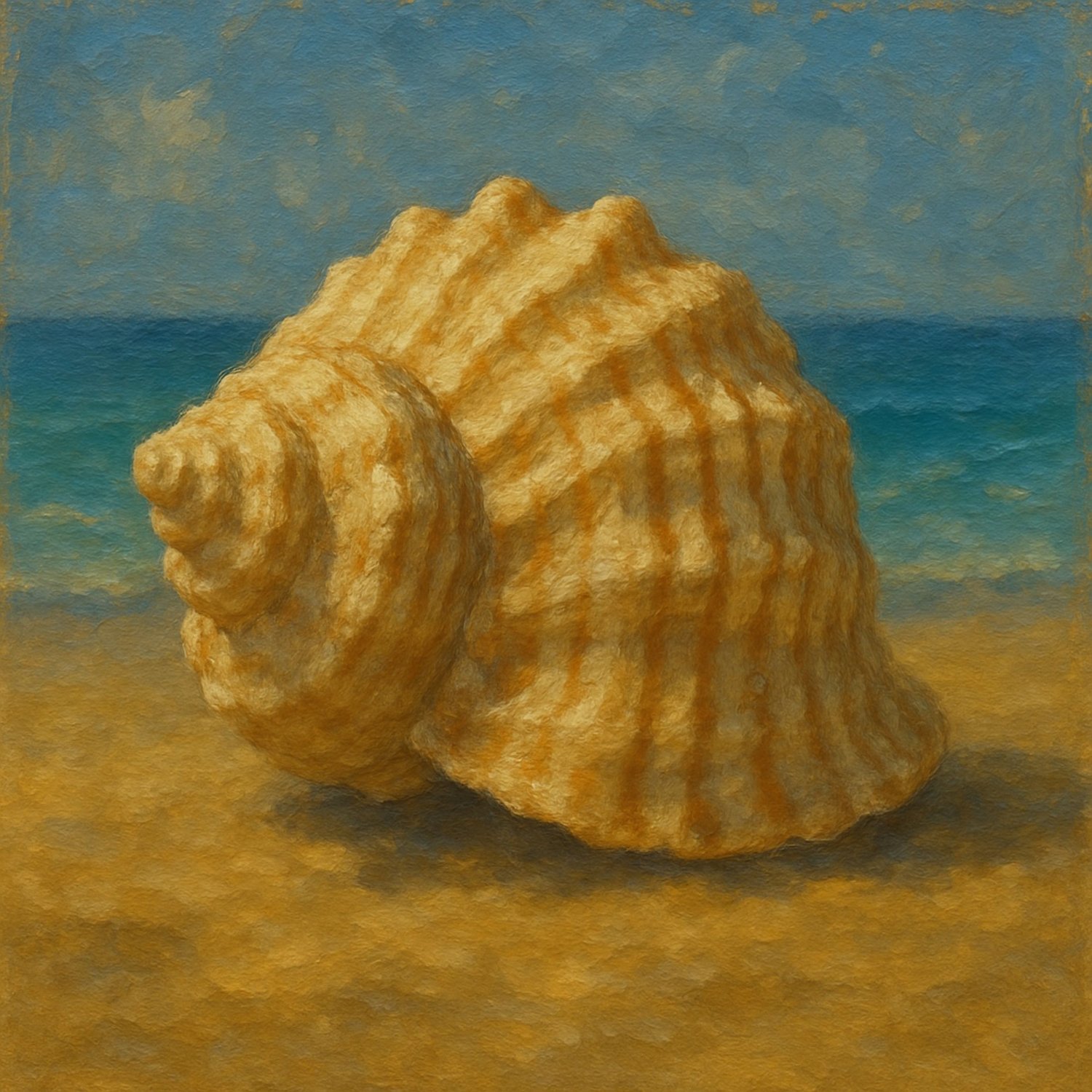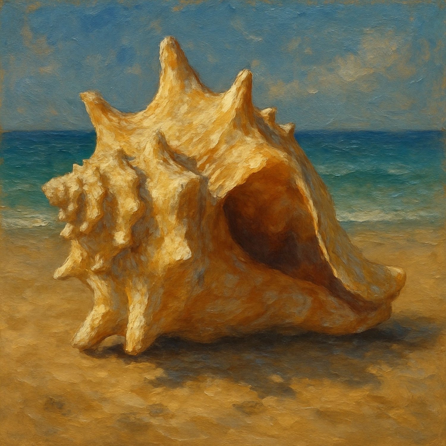 Bring the timeless beauty of the sea into your home with Conch by the Sea, stunning digital art prints inspired by traditional oil painting techniques. This artwork features a richly detailed conch shell resting on a golden shoreline, with a vibrant blue ocean stretching into the distance under a softly clouded sky.