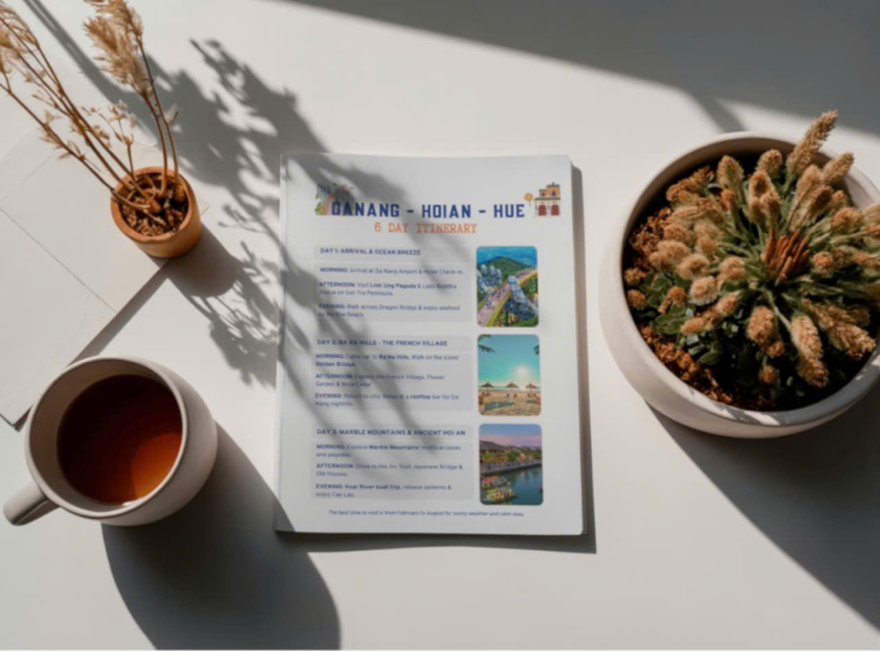 Experience the very best of Central Vietnam with this meticulously planned 6-day itinerary. From the modern vibe of Da Nang and the lantern-lit streets of Hoi An to the imperial grandeur of Hue, this guide is designed for travelers who want a seamless, high-quality, and authentic experience.