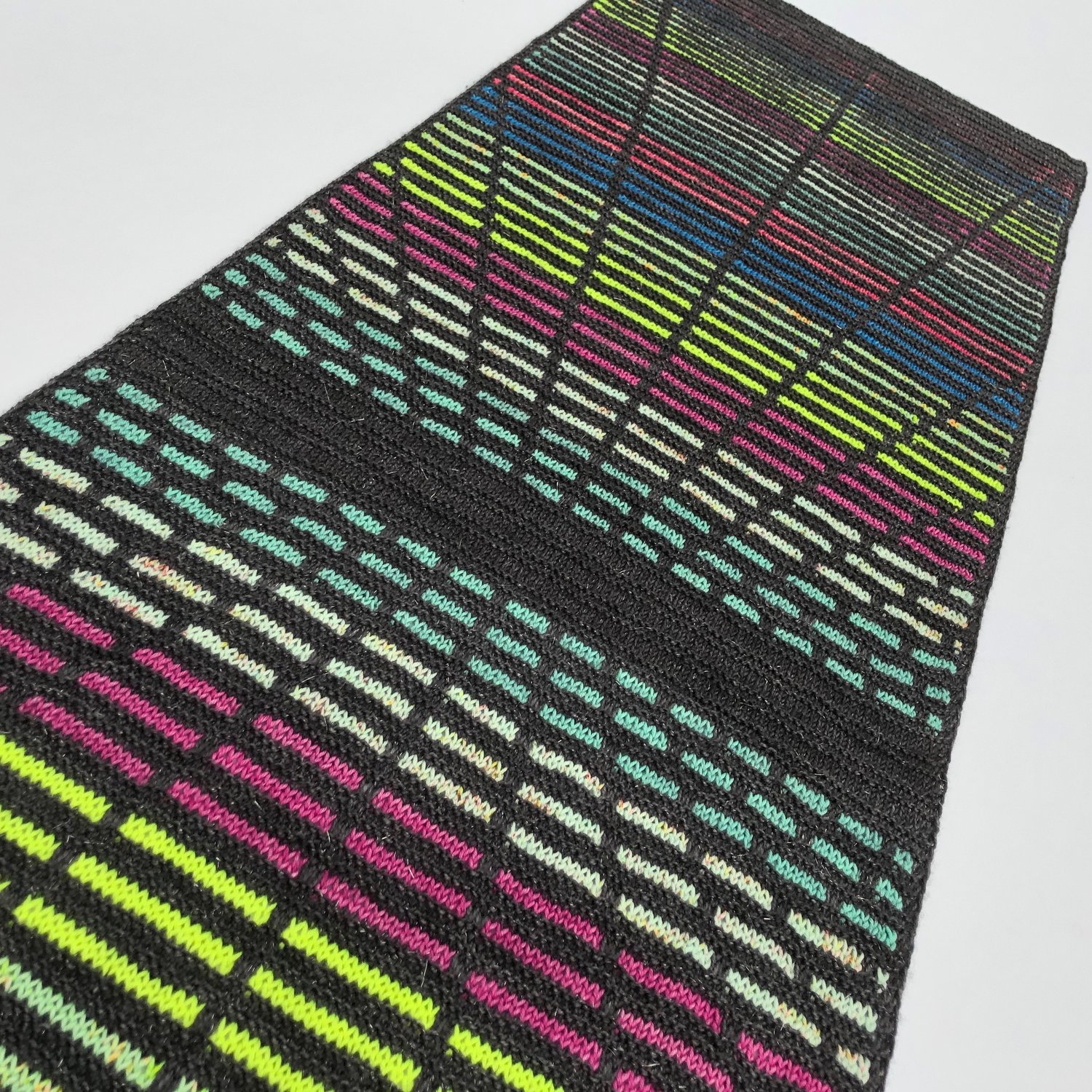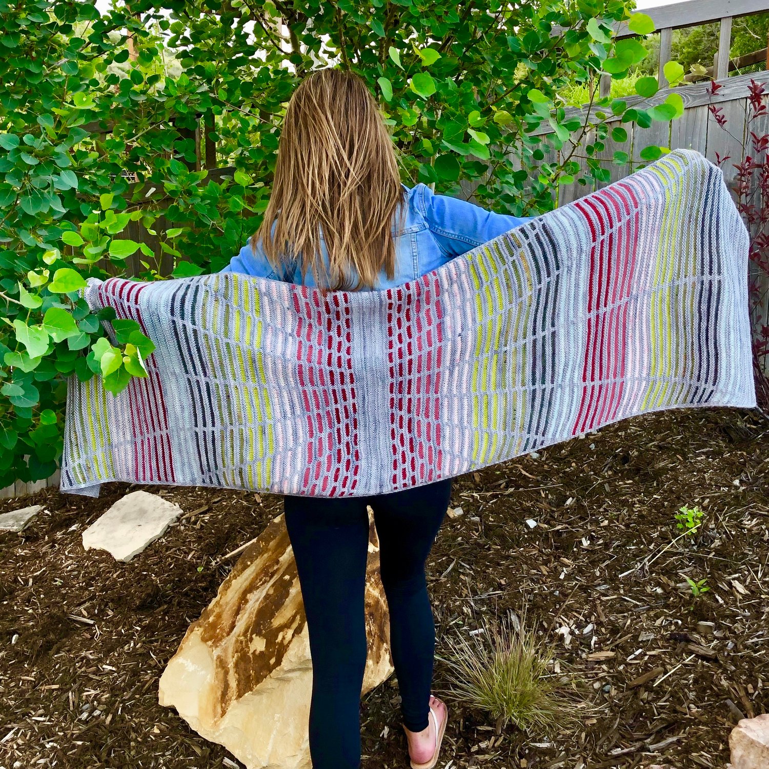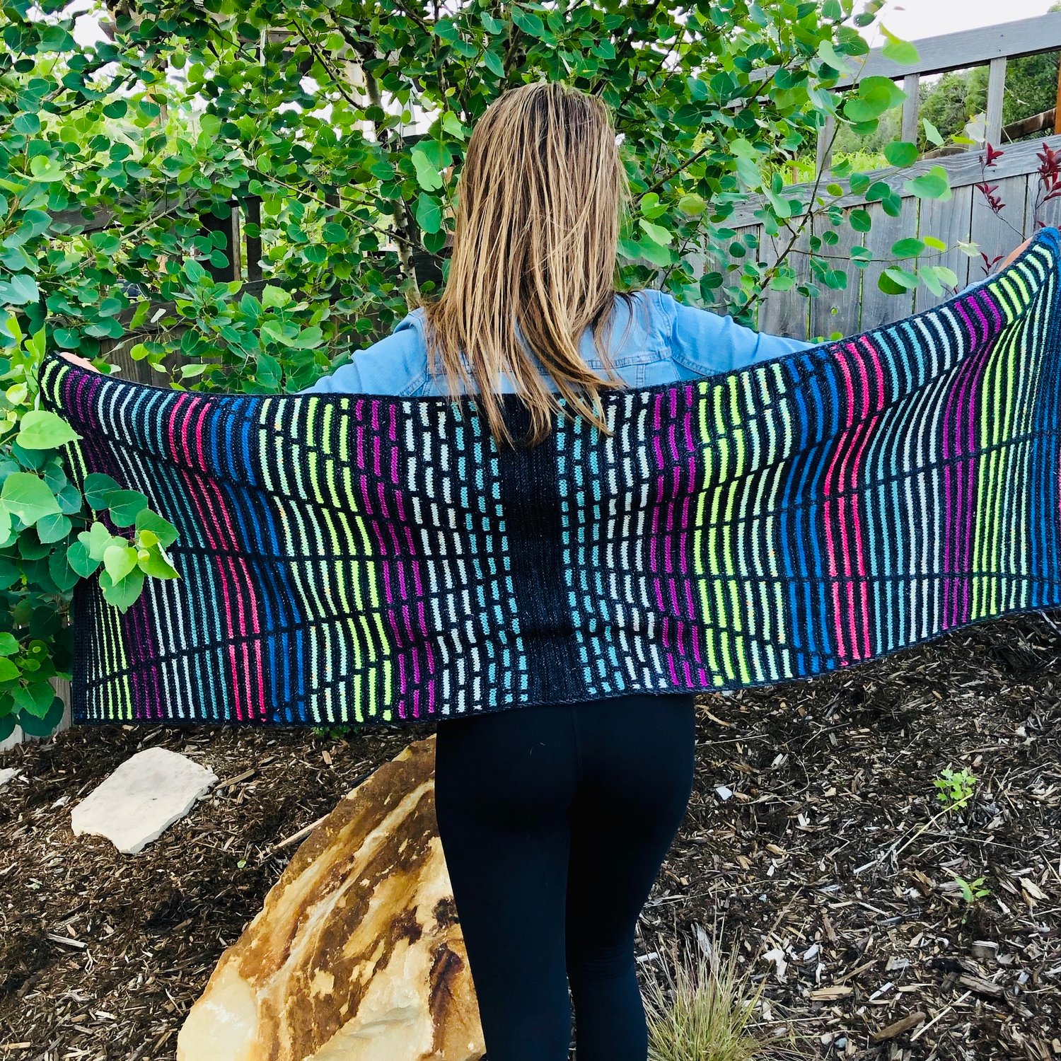 The wrap is knitted end-to-end and uses slipped stitches to create the wireframe design. Each half of the wrap has 42 contrast stripes in seven colors (84 total stripes). The color sequence is repeated twice per half, although alternative instructions are provided for a gradient (or whatever you please!) where each color is worked only once per half. The second half of the wrap is a mirror image of the first half.