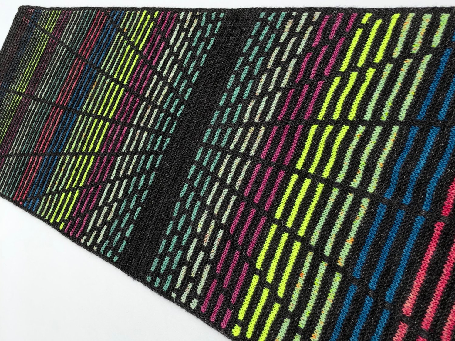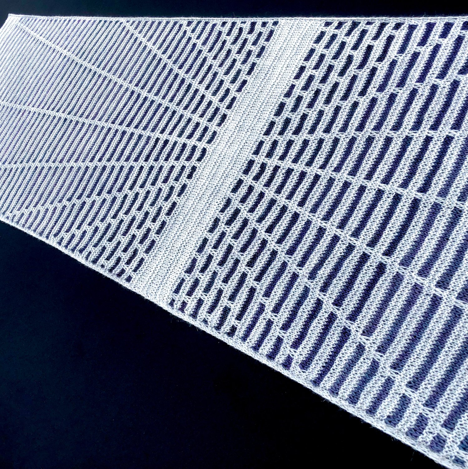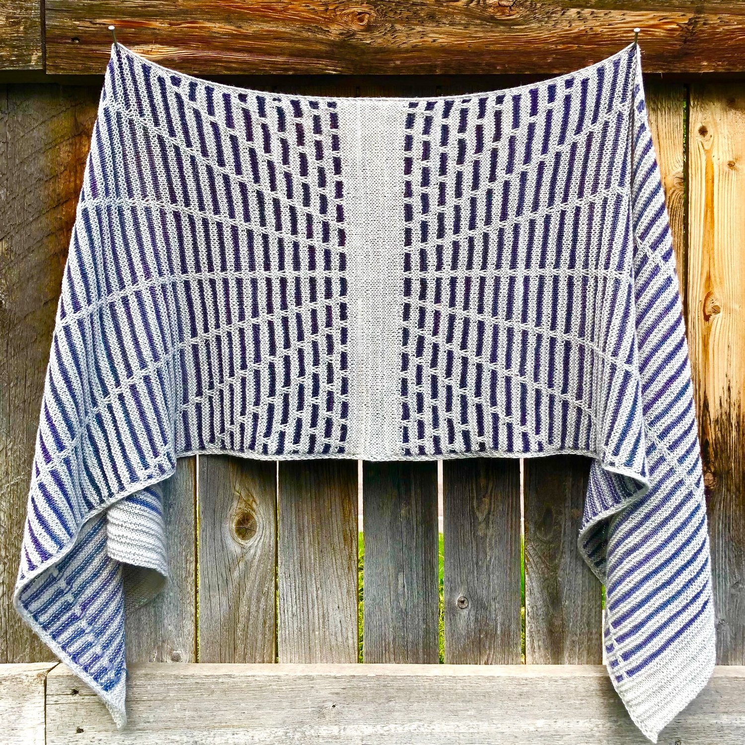 The wrap is knitted end-to-end and uses slipped stitches to create the wireframe design. Each half of the wrap has 42 contrast stripes in seven colors (84 total stripes). The color sequence is repeated twice per half, although alternative instructions are provided for a gradient (or whatever you please!) where each color is worked only once per half. The second half of the wrap is a mirror image of the first half.