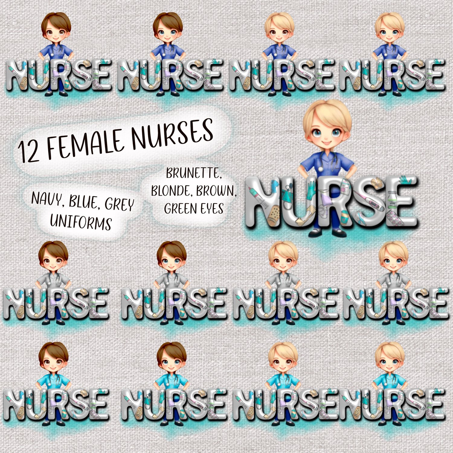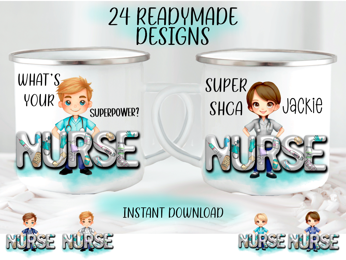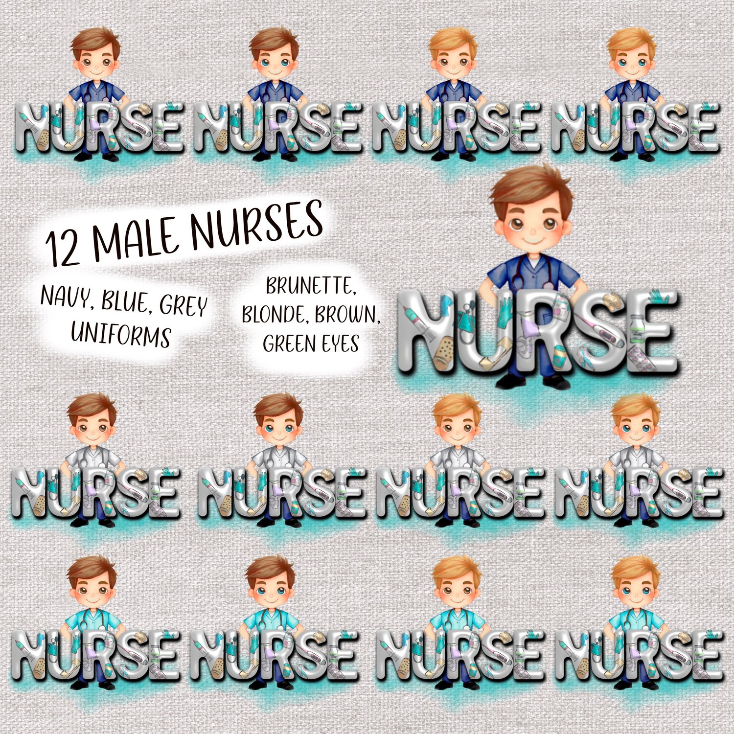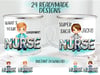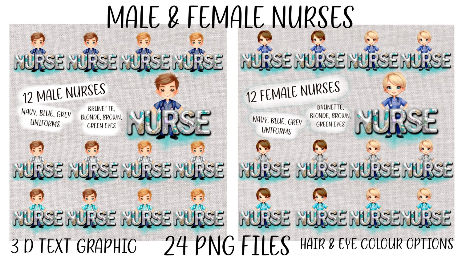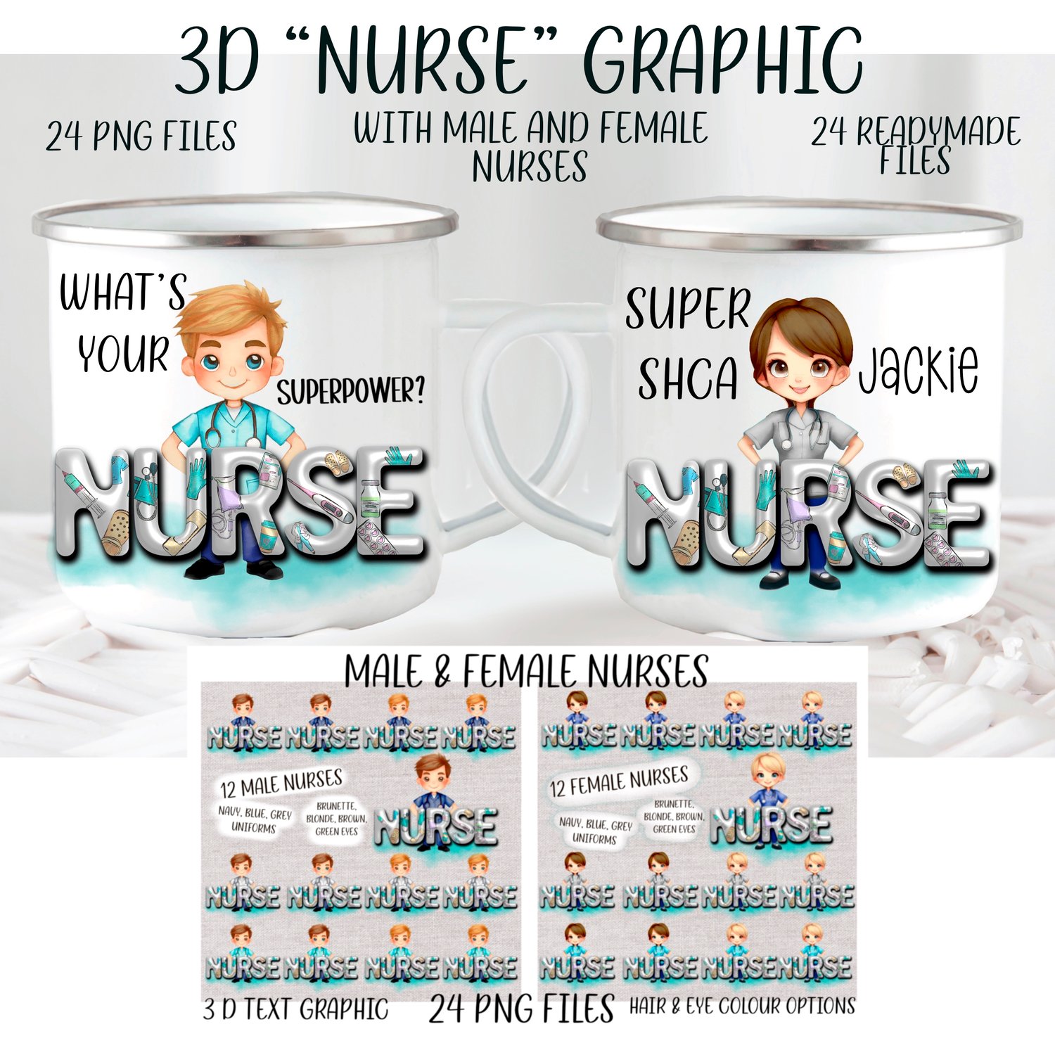 3D nurse. 24 complete designs, 12 male, 12 female nurses with 3D inflated “nurse” text. 3 uniform, 2 hair, 2 eye colours. 24 PNGs.