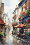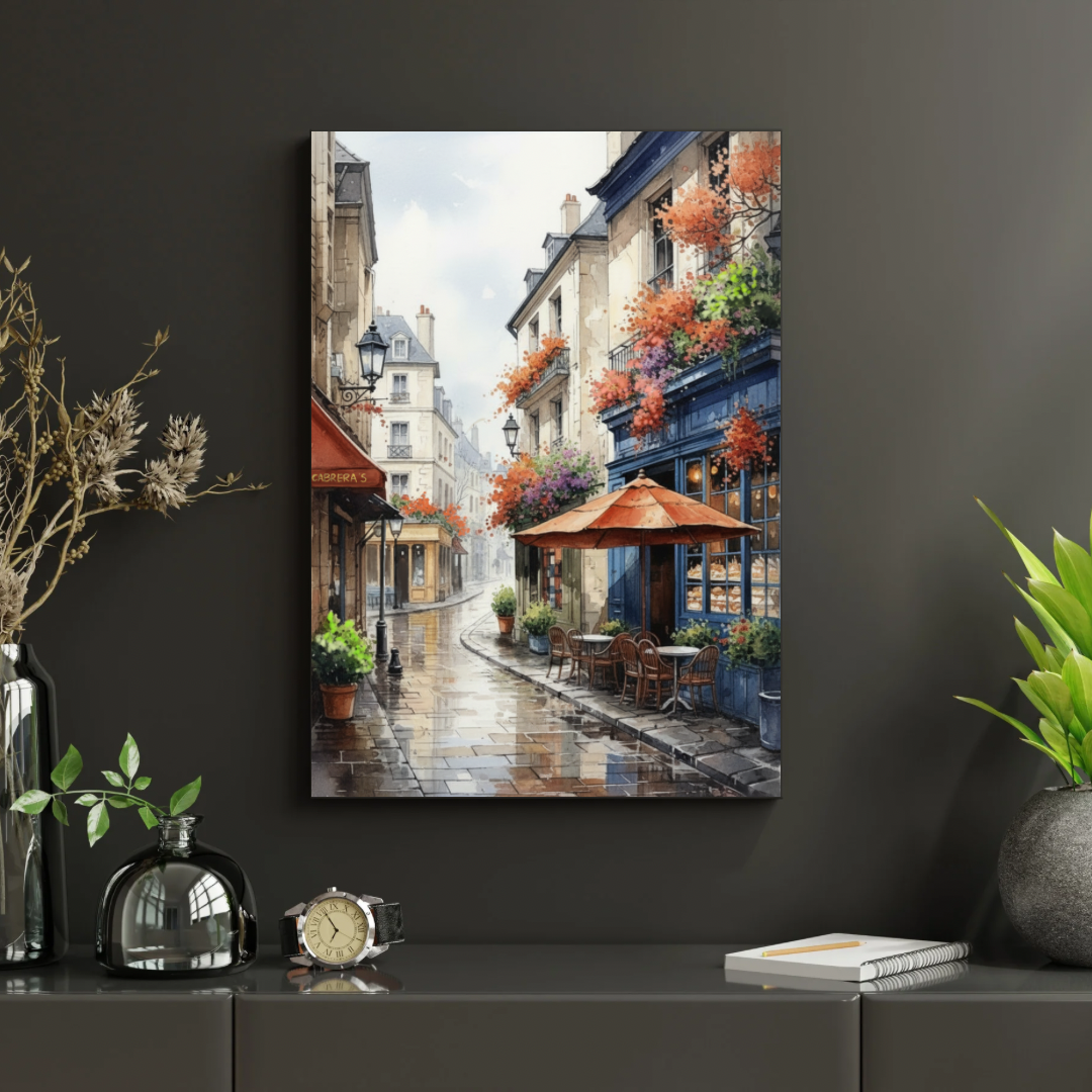 On a quiet, rain-washed street in Italy, the scene unfolds with a gentle charm beneath a cloudy sky still heavy from a recent shower. The narrow cobblestone path glistens with moisture, winding past a cozy bakery that offers fresh breads, its outdoor chairs and tables neatly arranged but empty, waiting for the return of sunshine and passersby. Clusters of vibrant orange flowers bloom along the edges of the street, their cheerful hues adding warmth to the muted tones of the day. Surrounded by quaint buildings and the soft hush of post-rain calm, the street feels peaceful and picturesque, like a moment frozen in serene simplicity.