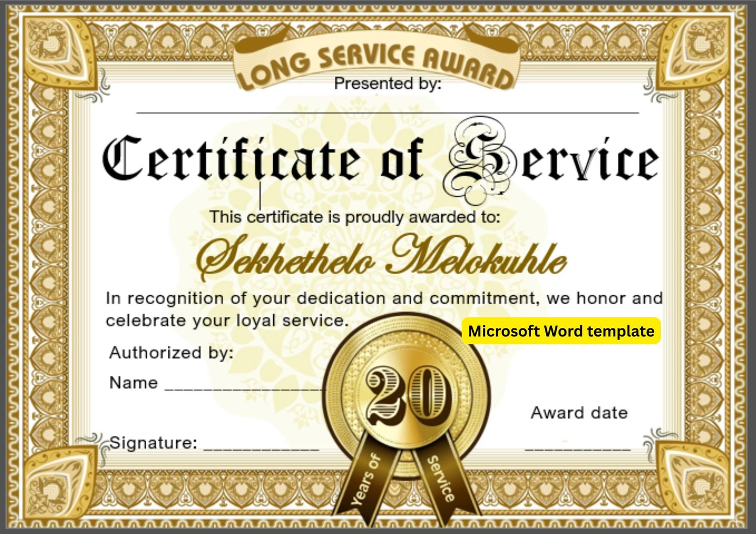 This is a professional landscape certificate template to recognize years of service. Fully editable in Microsoft Word — customize with names, dates, and details