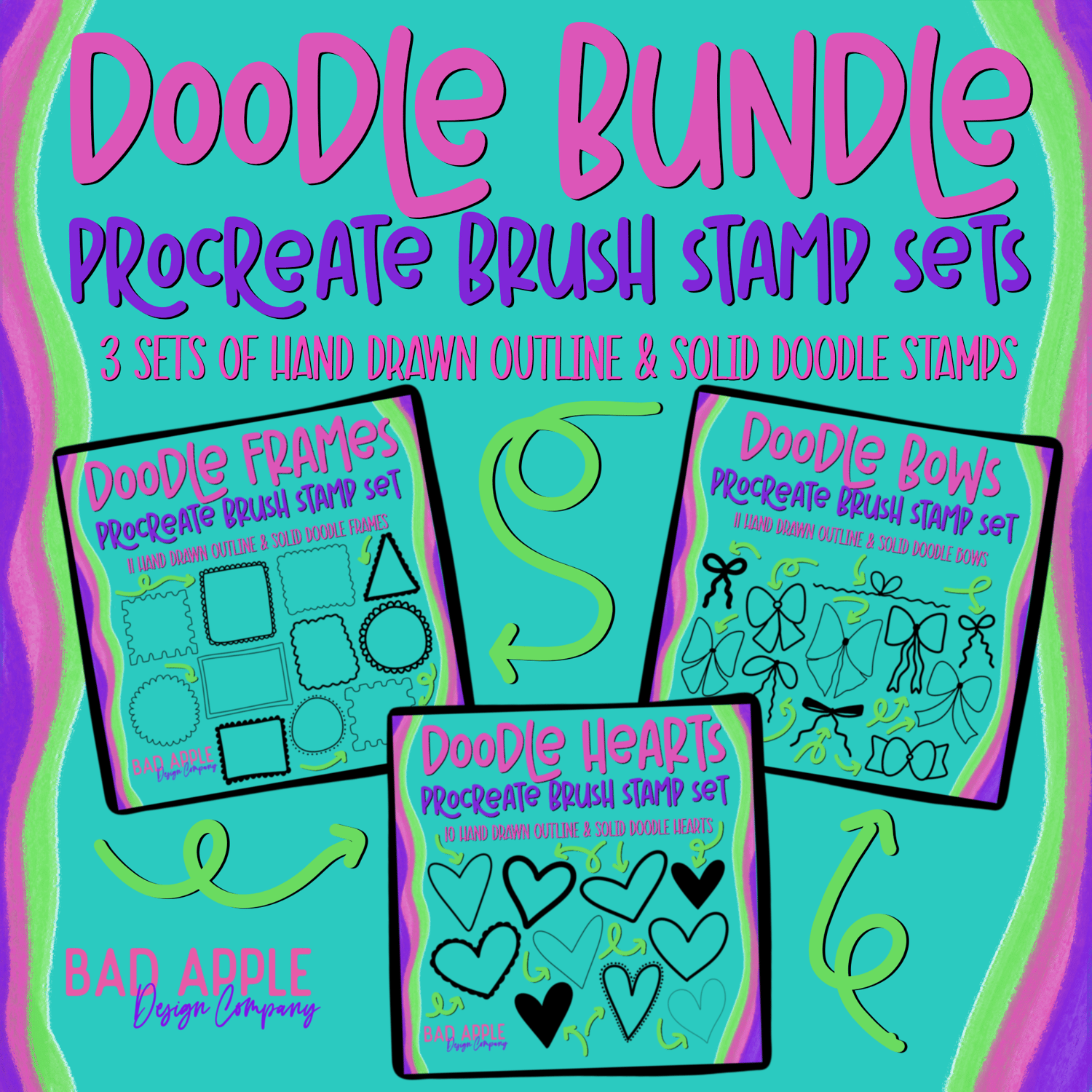The Procreate Doodle Essentials Brush Stamp Bundle includes all three of my full hand-drawn stamp sets, designed to make your digital art easier, faster, and way more fun.