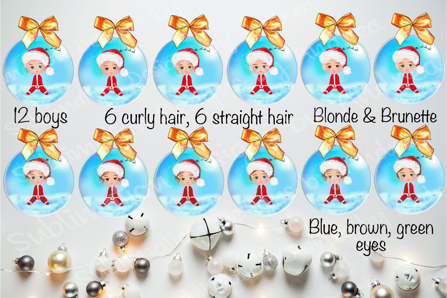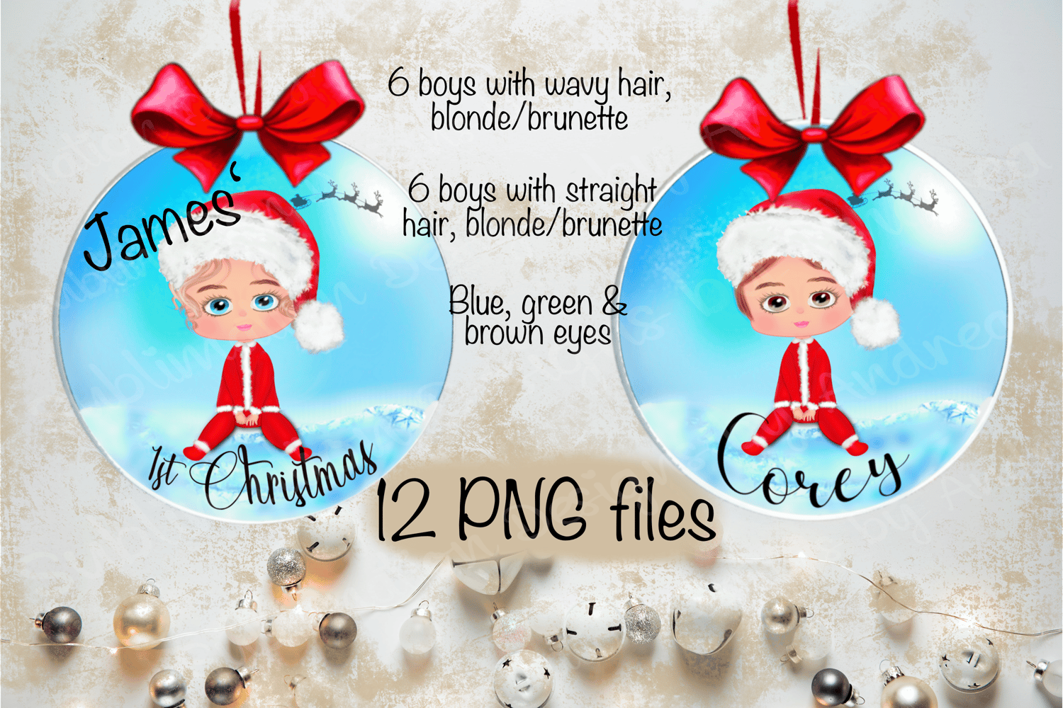 Baby Boys ‘sphere’ round bauble design. 12 PNG files; 2 hair styles in 2 colours, 3 eye colours. Plus separate curved text file '1st Christmas' in 'lonely basket' font - so you choose to use this or make your own text.