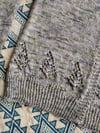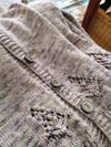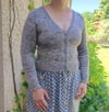 Masula is a small, very feminine cardigan with a wide V-neck, pretty lace at the bottom and fancy ribbing on the body and cuffs.