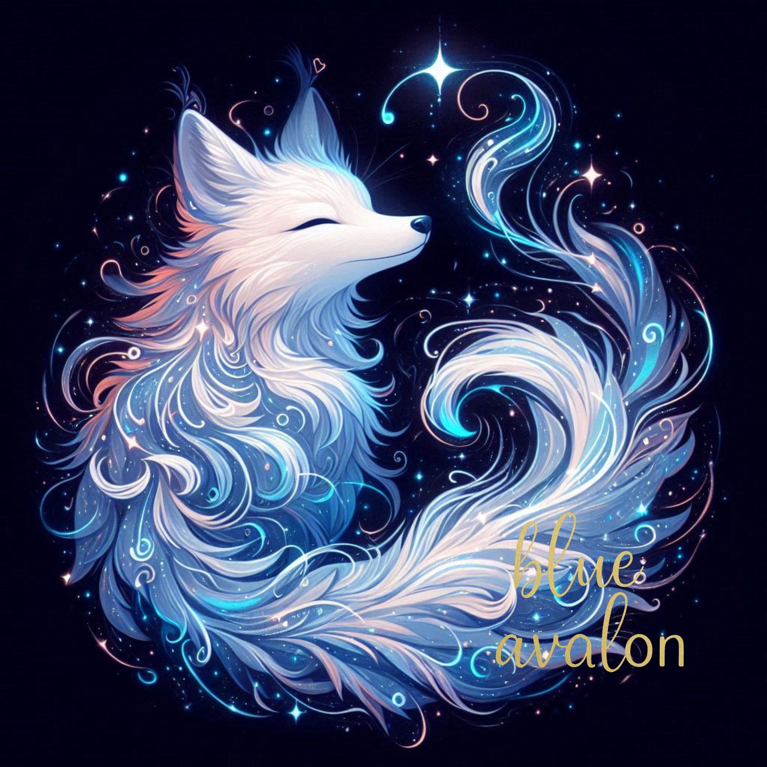 A spirit fox with swirling fur and tail. Colours are mainly blues and white with a slight sparkling effect.