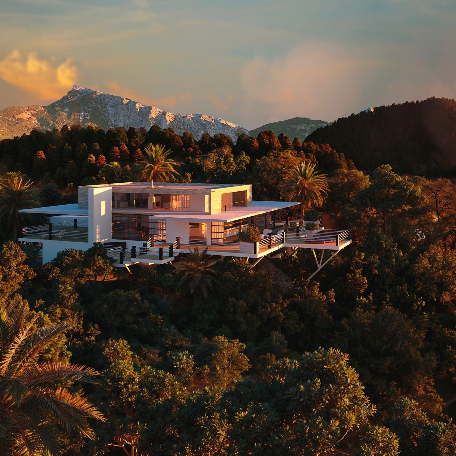 Mountains - Explore the scattered trees and Sketchfab assets to create stunning foggy mountain environment for your projects with golden hour sunset HDRI settings.