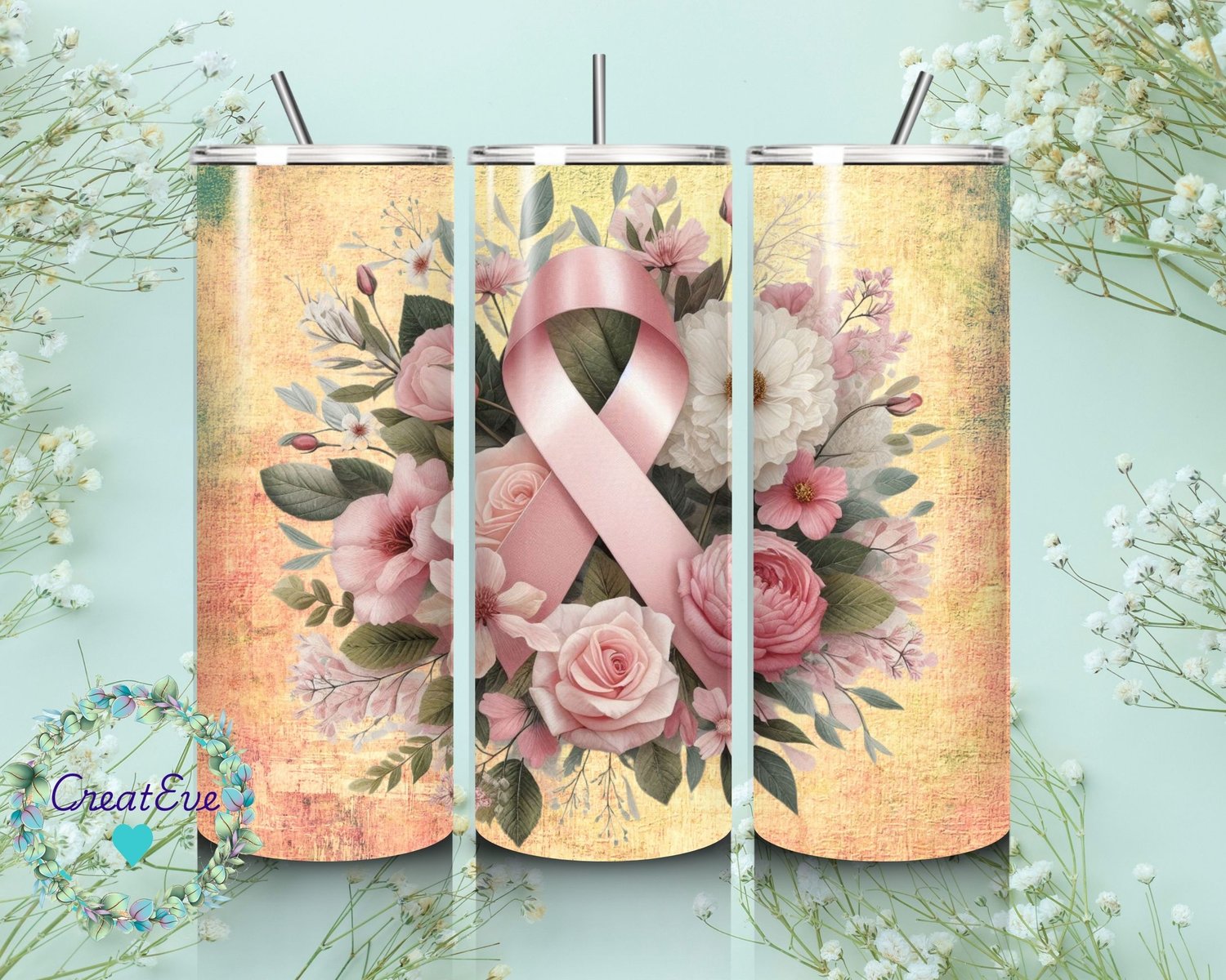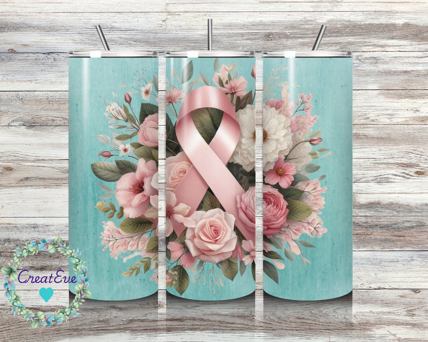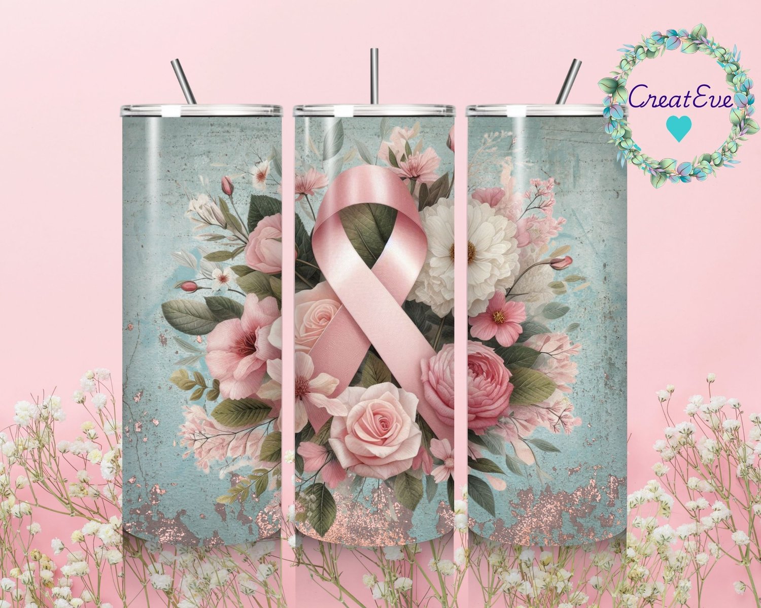 Breast Cancer Pink Ribbon Flower Bouquet 20oz Skinny Tumbler Wrap Bundle
