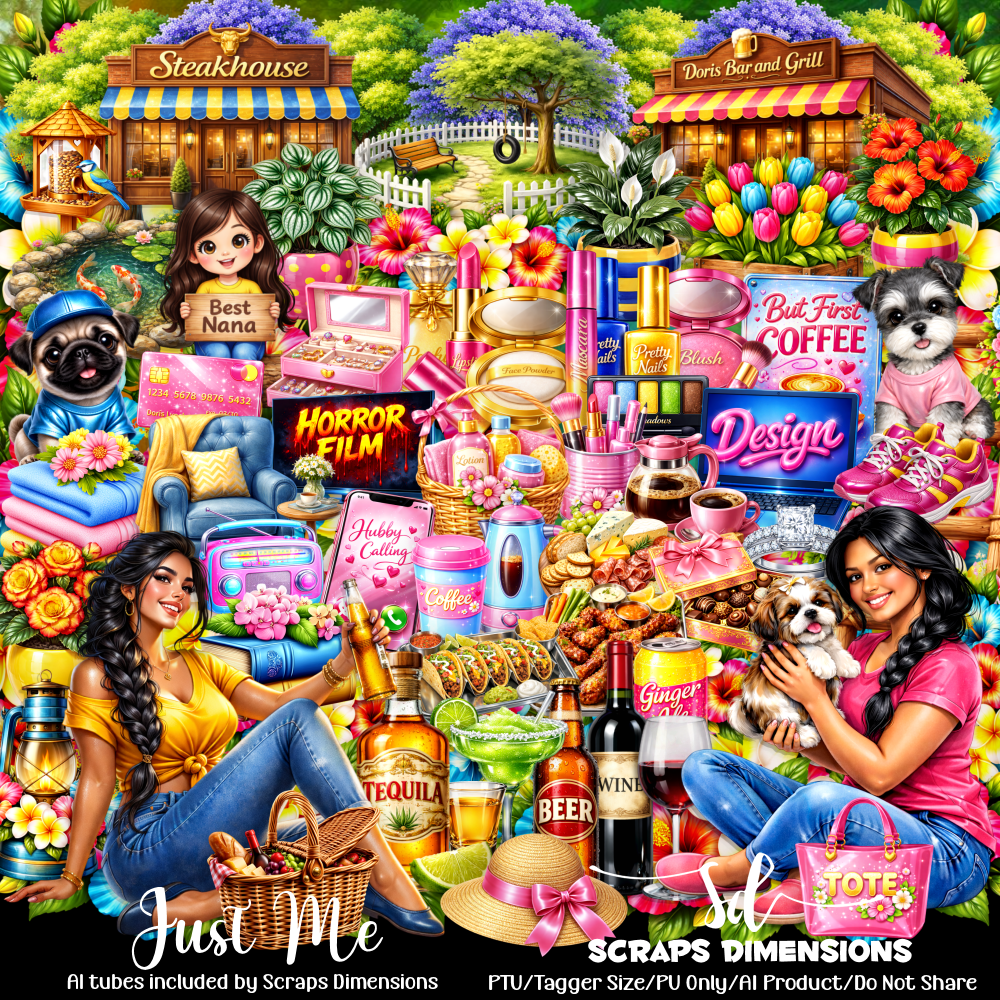 This kit contains 80 fabulous elements, 12 backgrounds and 2 AI tubes by me Scraps Dimensions. All elements in this kit are AI generated by Scraps Dimensions. This kit was inspired by a Just Me challenge made by Lizzy Hart/Doodle By Design. Most elements in this kit show things that I enjoy in life. Tagger size. Perfect for your tags and projects. Personal use only. Enjoy!