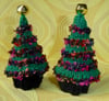 These trees are knitted from the bottom up. There are two designs and the pattern includes instructions to work them both flat and then seamed or in the round.Tree one is knitted in smooth stocking stitch with ridges up the tree, these are shown knitted in contrast novelty yarn in the pictures.