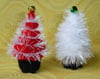 Either tree could be knitted entirely in novelty yarn once the base is completed. It is the base that contains the Ferrero Rocher and supports the weight of the tree so this is best knitted in regular yarn. The white tree pictured is an example of tree 2 knitted in eyelash yarn.