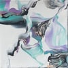 Swirling lacy swipes of turquoise blue, violet, gold, and gray on white.