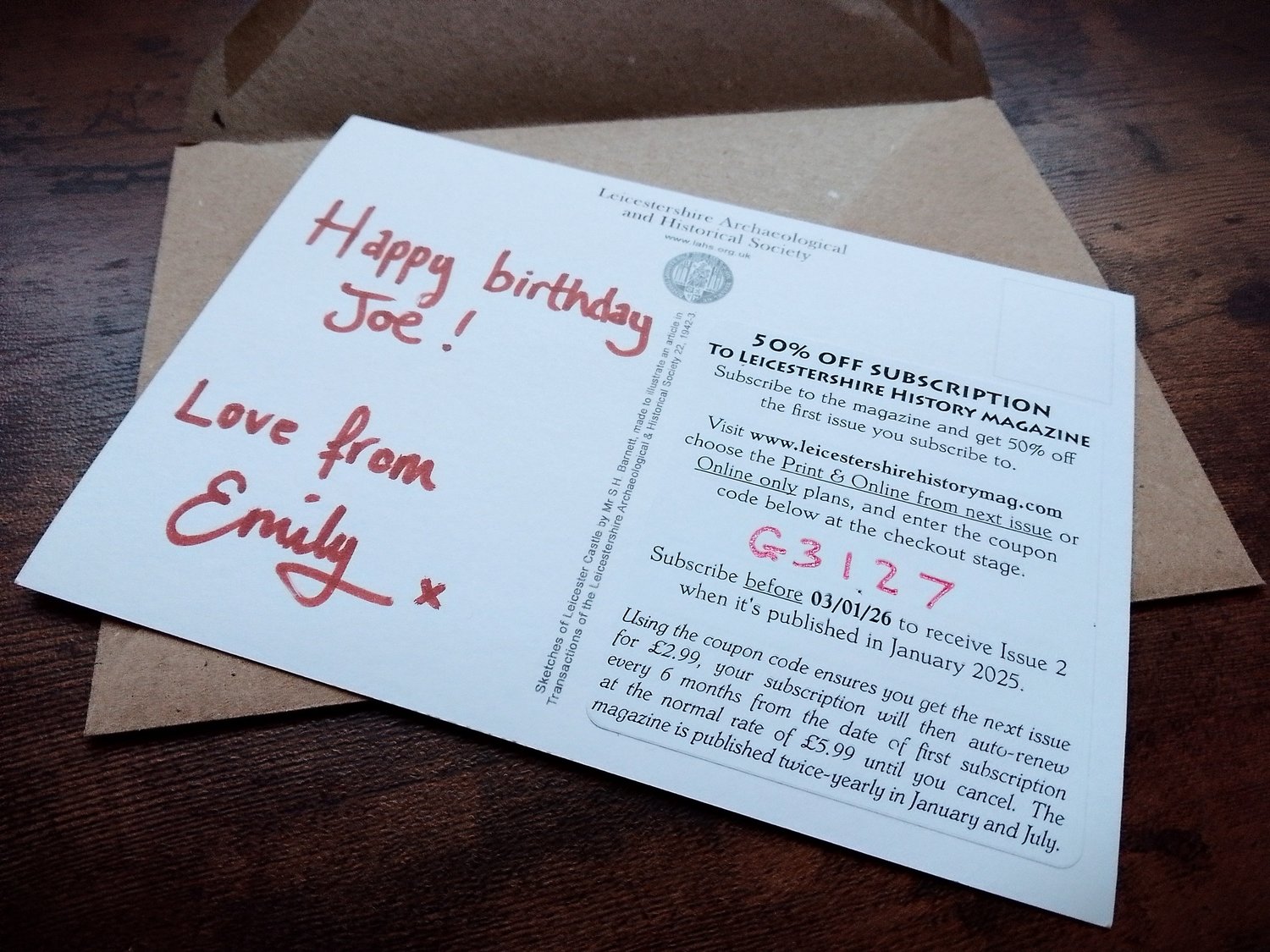 When you purchase this gift option you receive a copy of the latest issue, plus a truly unique Leicestershire-themed postcard and discount code offering the recipient 50% off the next issue should they choose to subscribe.