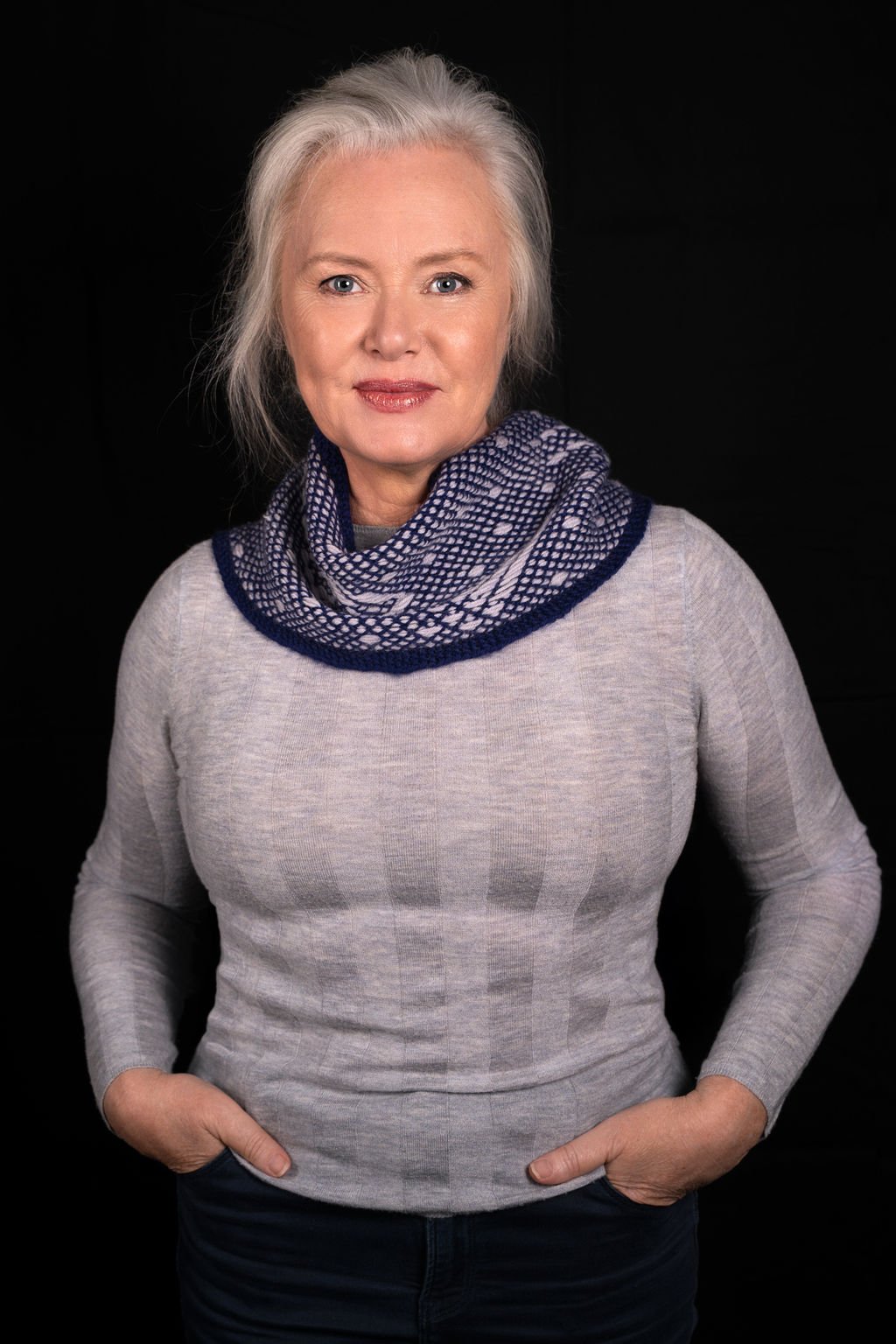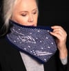 The unique woven effect plays with pattern and texture. Choose two high contrast colours. MC makes the longer floats used to create the UFOs or UAPs (light grey in the sample). CC makes the background colour (deep blue). Add your own fun with beads, metallic or shiny embroidery thread. The pattern makes a dense and cuddly cowl using only 3 x 50gm balls.