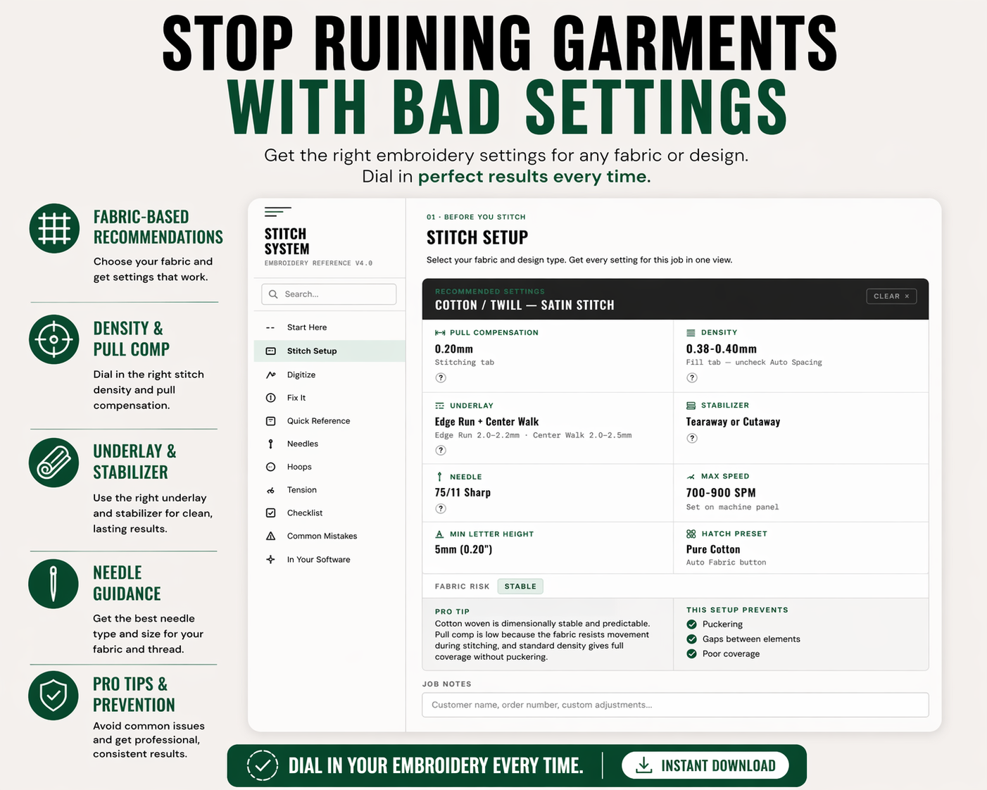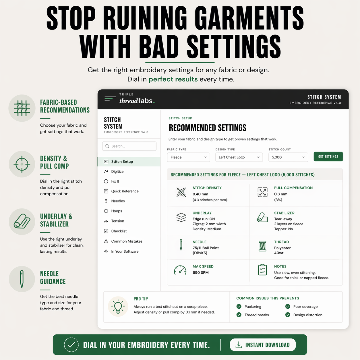 Get recommended stitch density, pull compensation, underlay, needle, and stabilizer settings based on your fabric and design type. Built by an embroiderer, for embroiderers. Stop ruining garments because your settings were off.