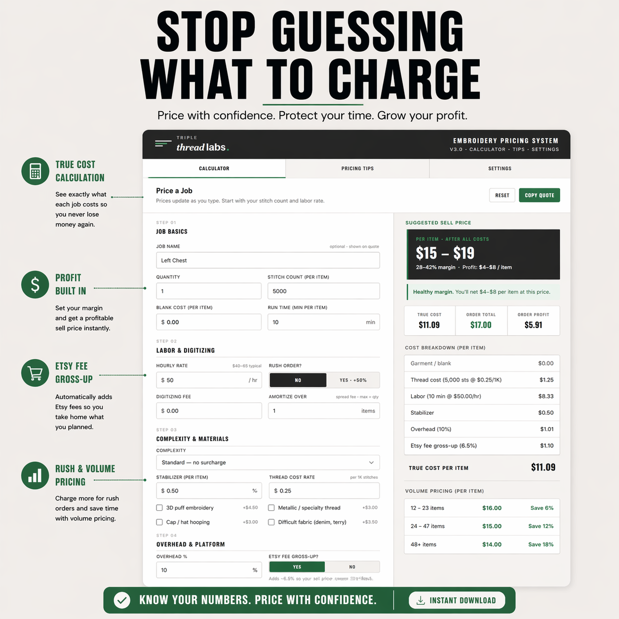 Enter your stitch count, labor rate, garment cost, and overhead — get your true cost and a profitable sell price instantly. Includes Etsy fee gross-up, rush rate support, and volume pricing. No more guessing what to charge.