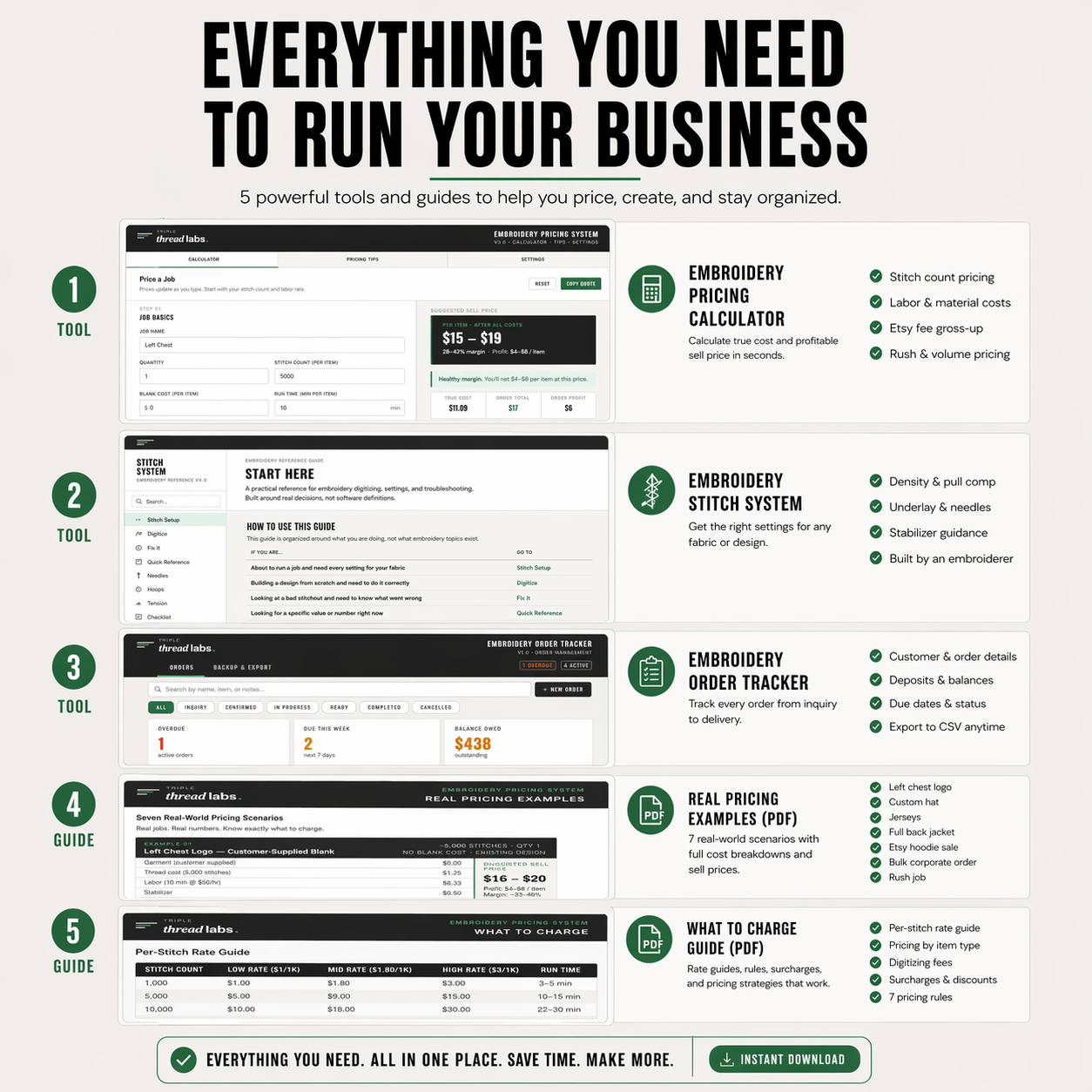 Embroidery Business Starter Kit | Pricing Calculator, Stitch System, Order Tracker & Pricing Guide | 5-Tool Bundle