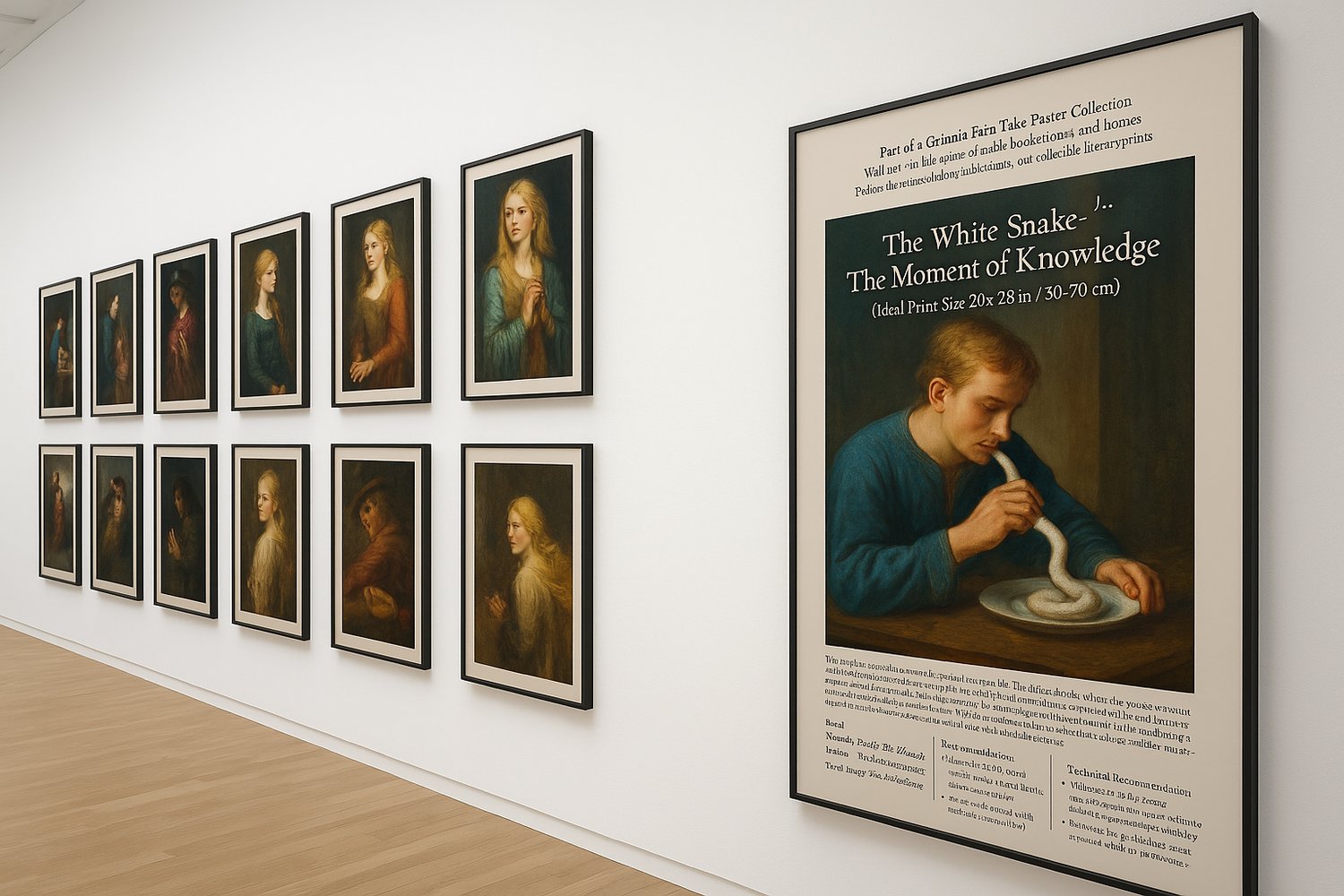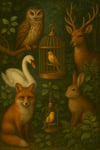 This detailed artwork captures the symbolic animals of Grimm's timeless fairy tales, including a wise owl, graceful swan, clever fox, delicate bird, gentle rabbit, and noble stag. Ideal for enthusiasts of folklore, fairy tale collectors, educators, and art lovers seeking deep symbolism and enchantment.