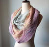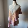 I went with a crescent shape that would be easy to wear, and I transitioned between the colorways by marling the yarn. I kept the whole thing relaxed by using Irish moss for the main field and garter stitch for the edge.